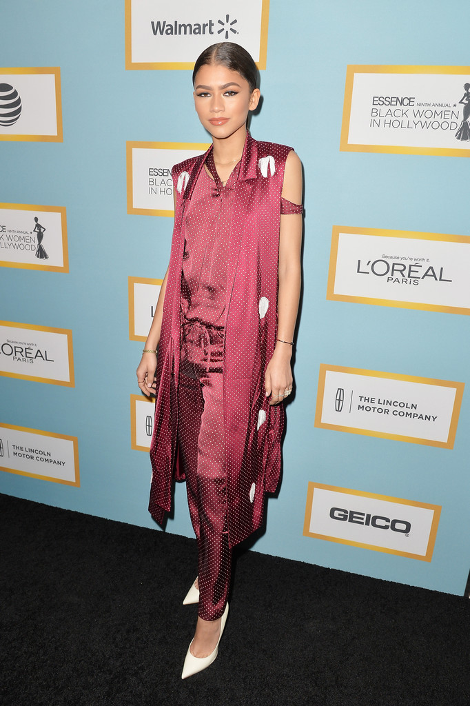 The always fashionable Zendaya stepped on the scene in a burgundy Thakoon silk dot robe and jumpsuit, pairing it with some white pumps. I’d wear this outfit in a heartbeat!
