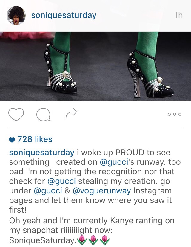 After seeing what Gucci, whose highly sought-after collection showed on Wednesday, Saturday and her fans took to social media to highlight the interesting similarities between her own work and that on a black tote bag from look 19 of the show: the word ‘real’ spray painted over the official Gucci logo. In an Instagram post, that has since been deleted, the stylist noted “too bad I’m not getting that check for @Gucci stealing my creation” expressing that she was proud to see her work on the runway but unhappy with the lack of acknowledgement that it was her bag that drove the inspiration.