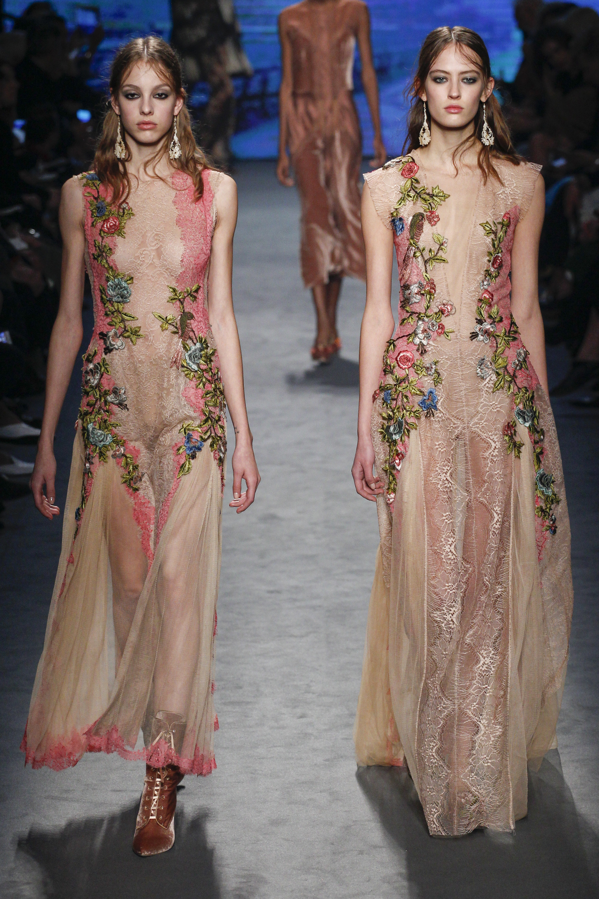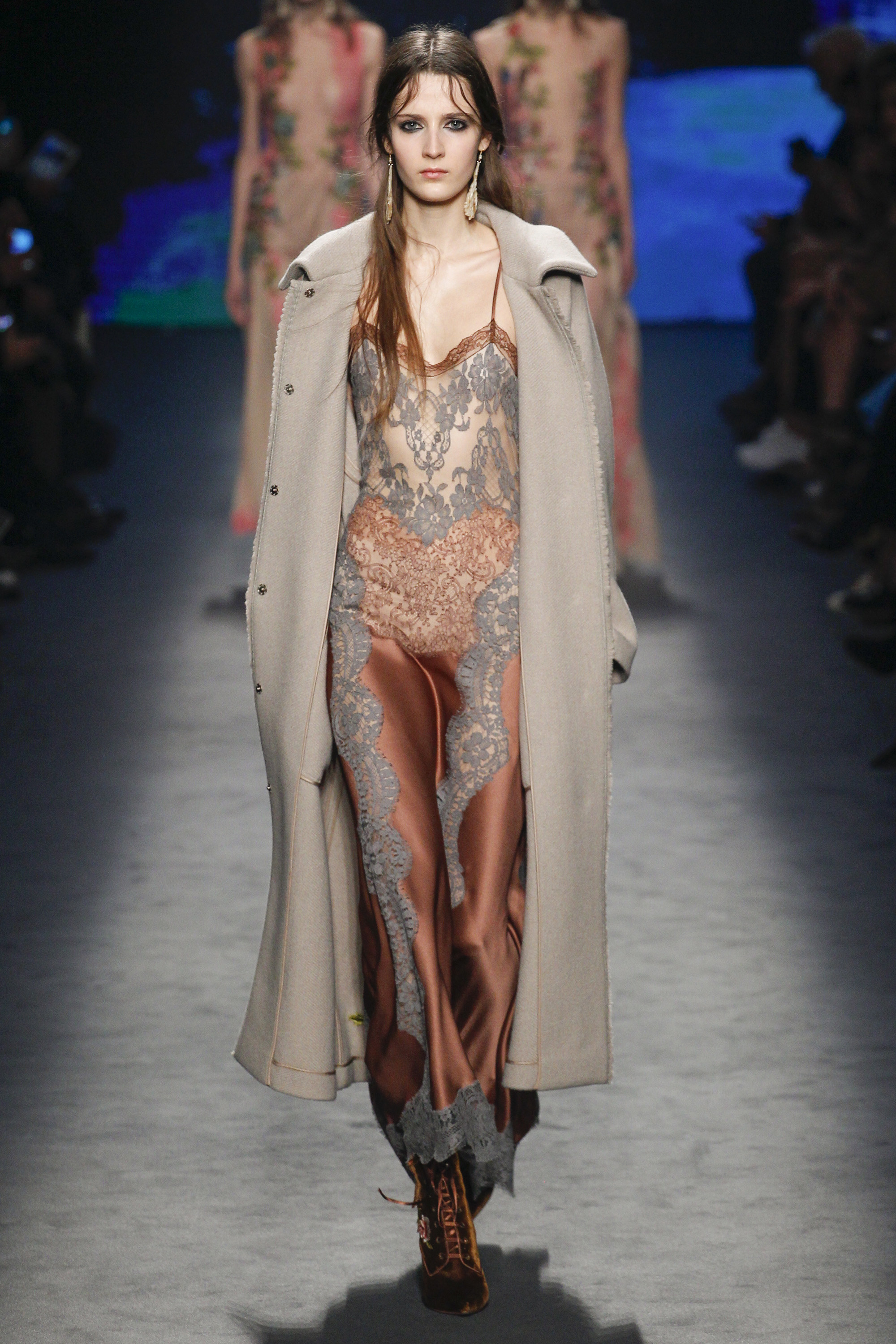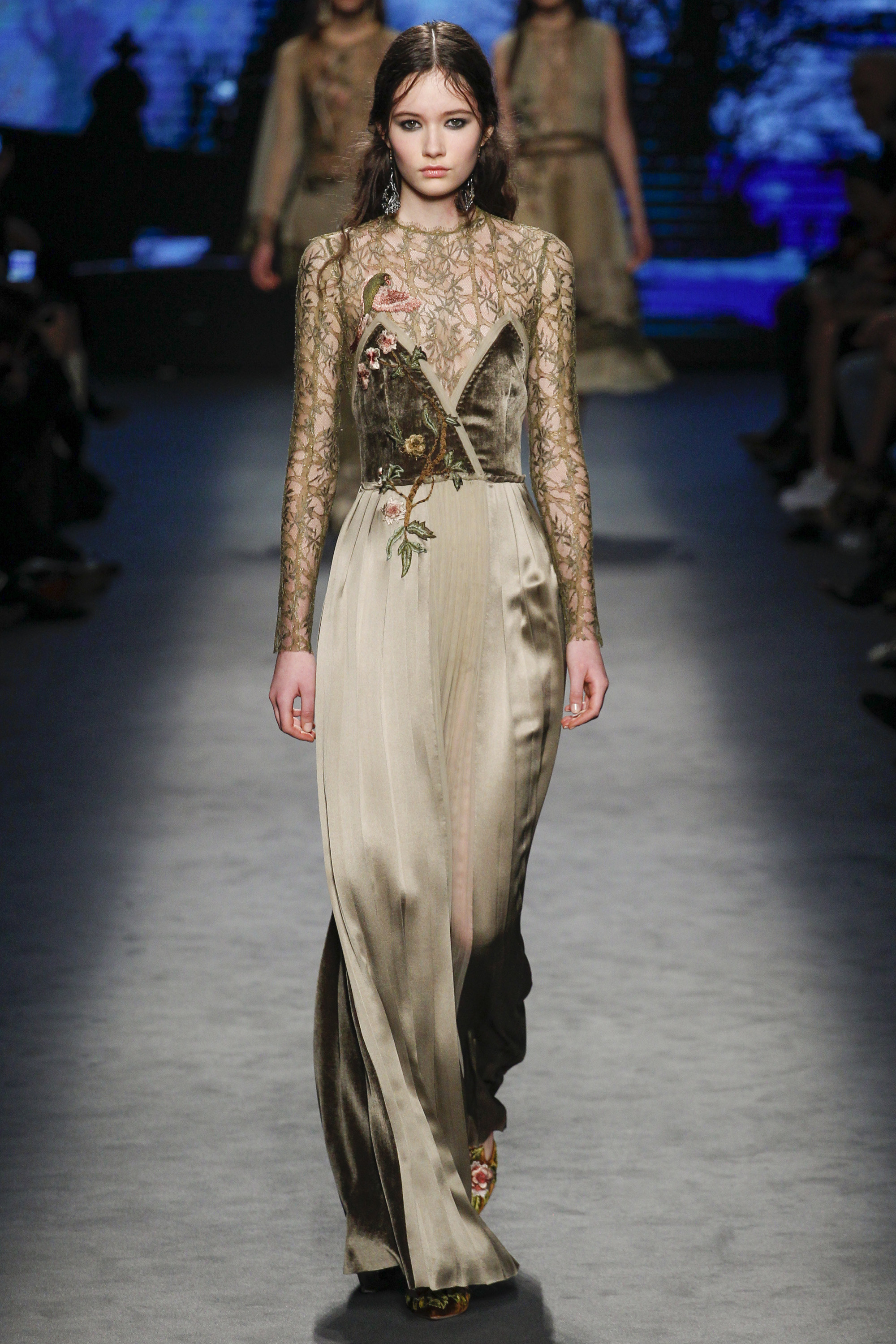Floral print, lace, fanciful embroidery, princess-perfect tulle: these elements lie at the foundation of the Alberta Ferretti brand. Her looks consistently make the red carpet a prettier place and inject an unforgettable delicacy and charm into any affair where they’re worn. Her trademarks were all on display for Fall.