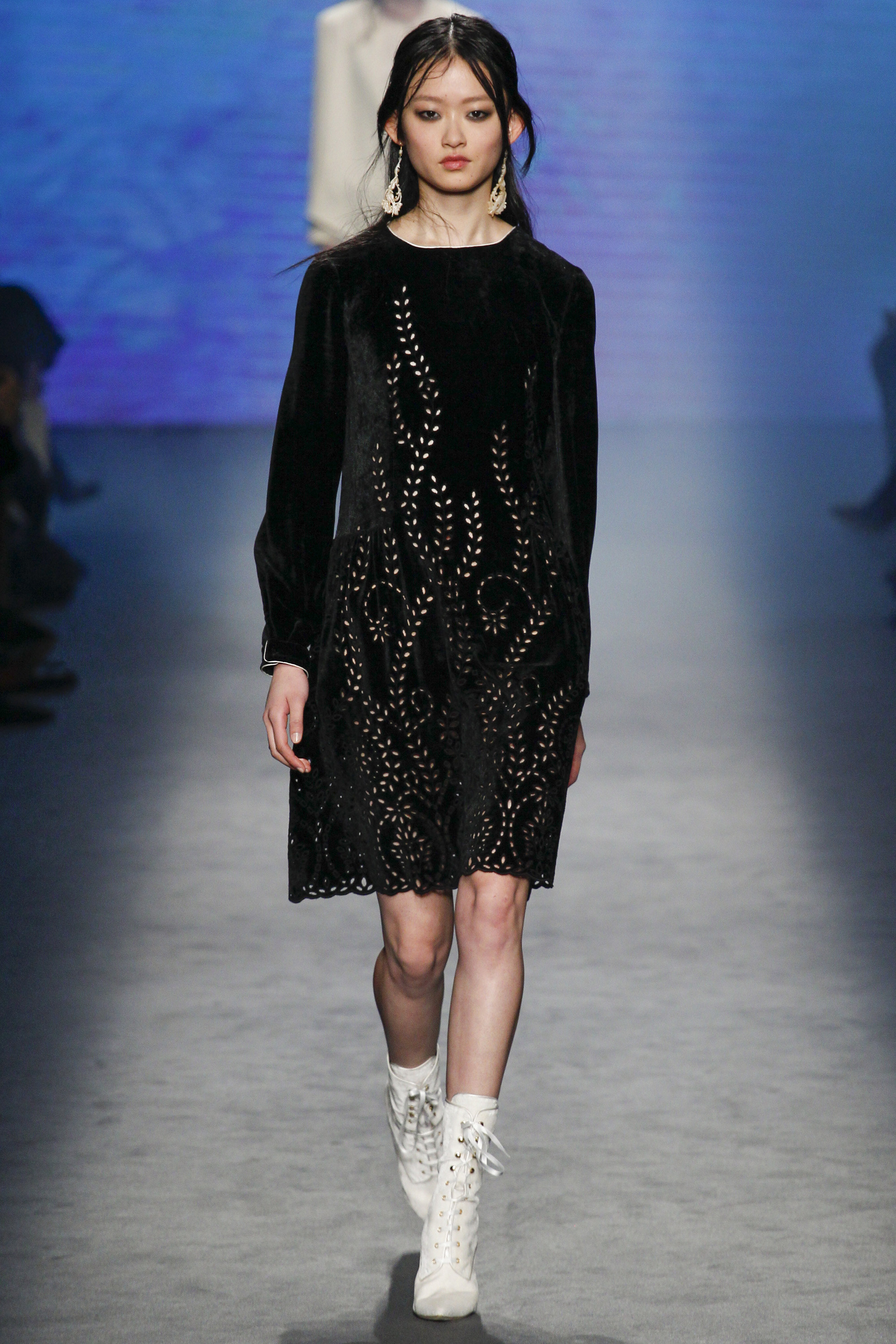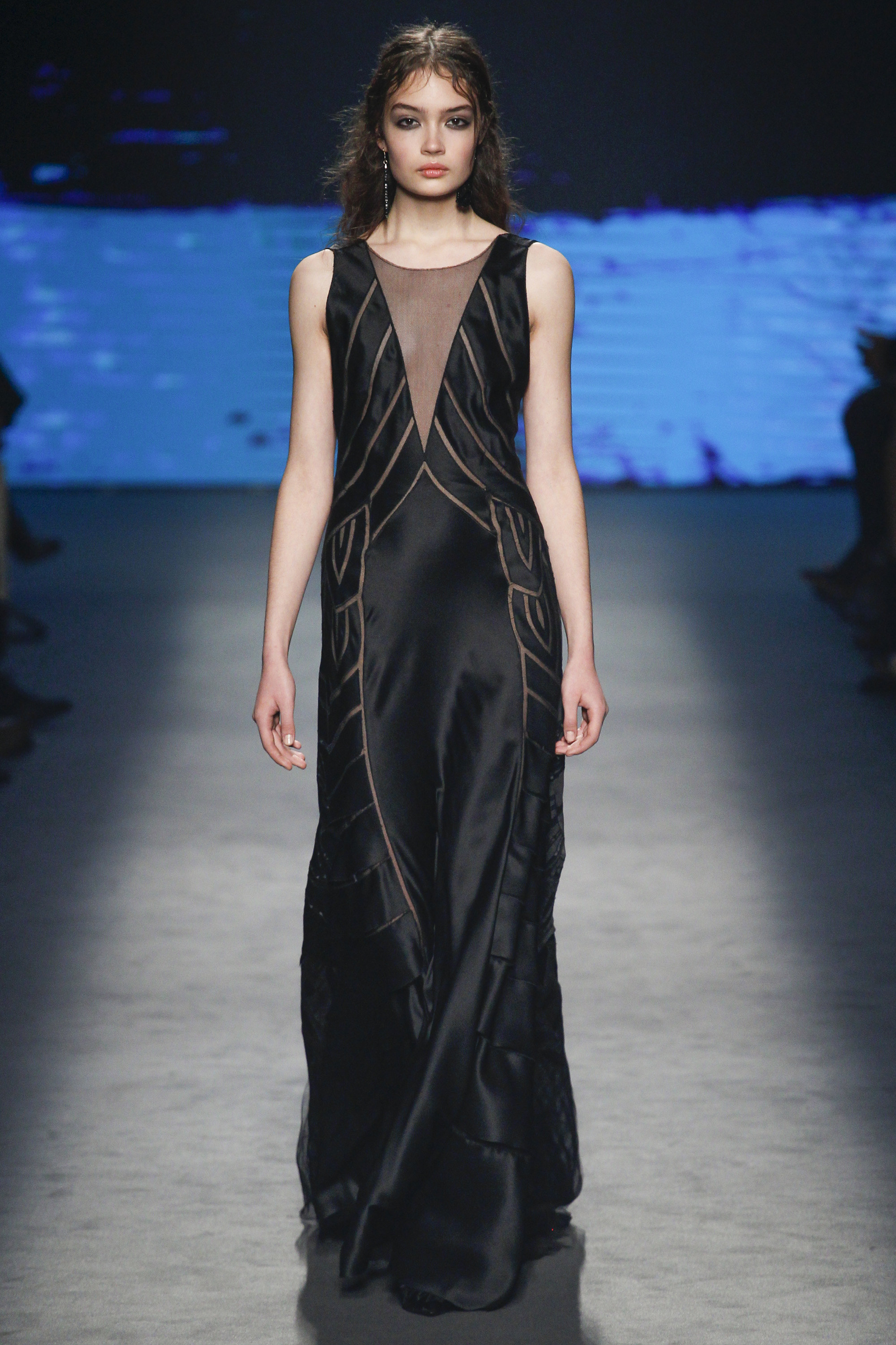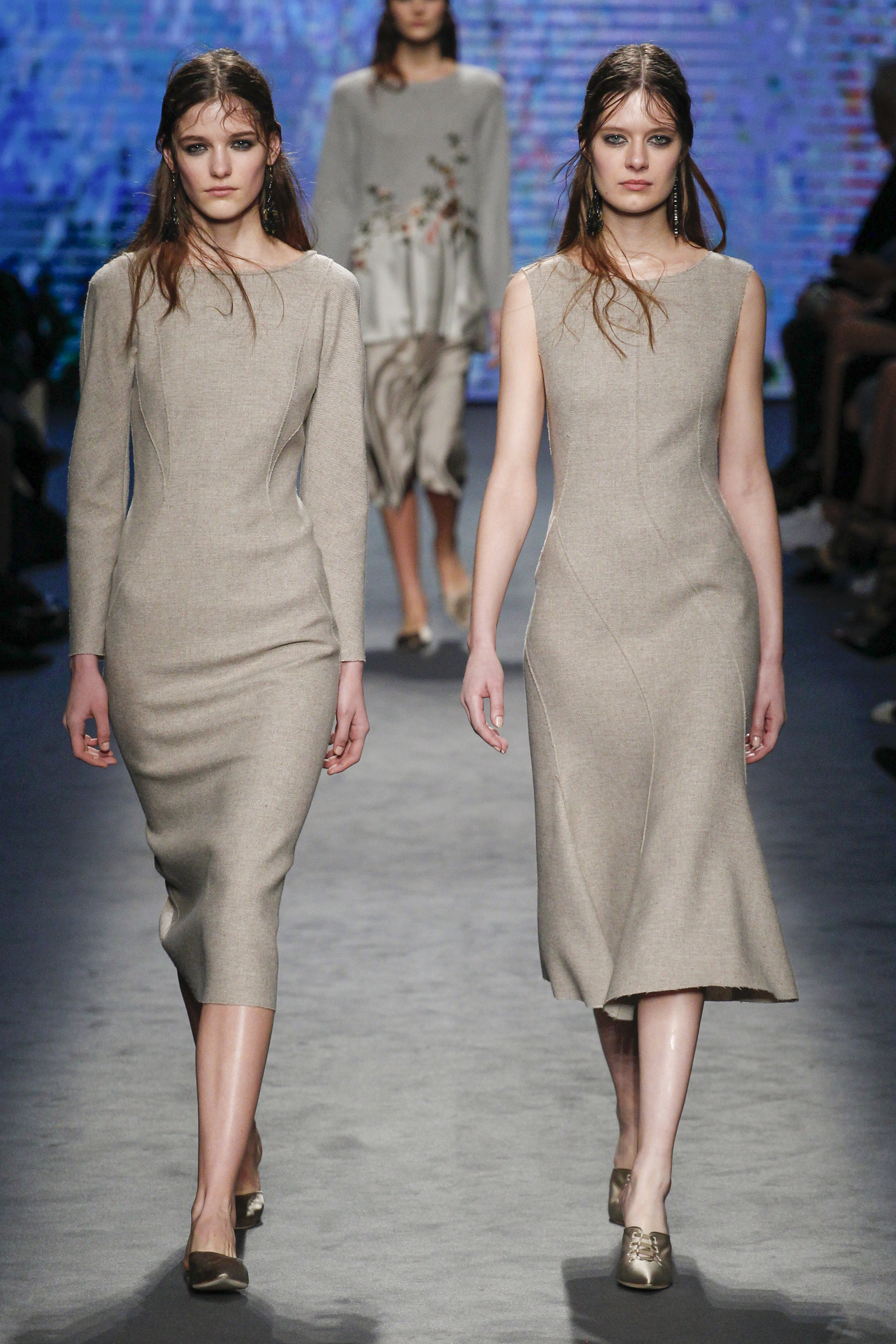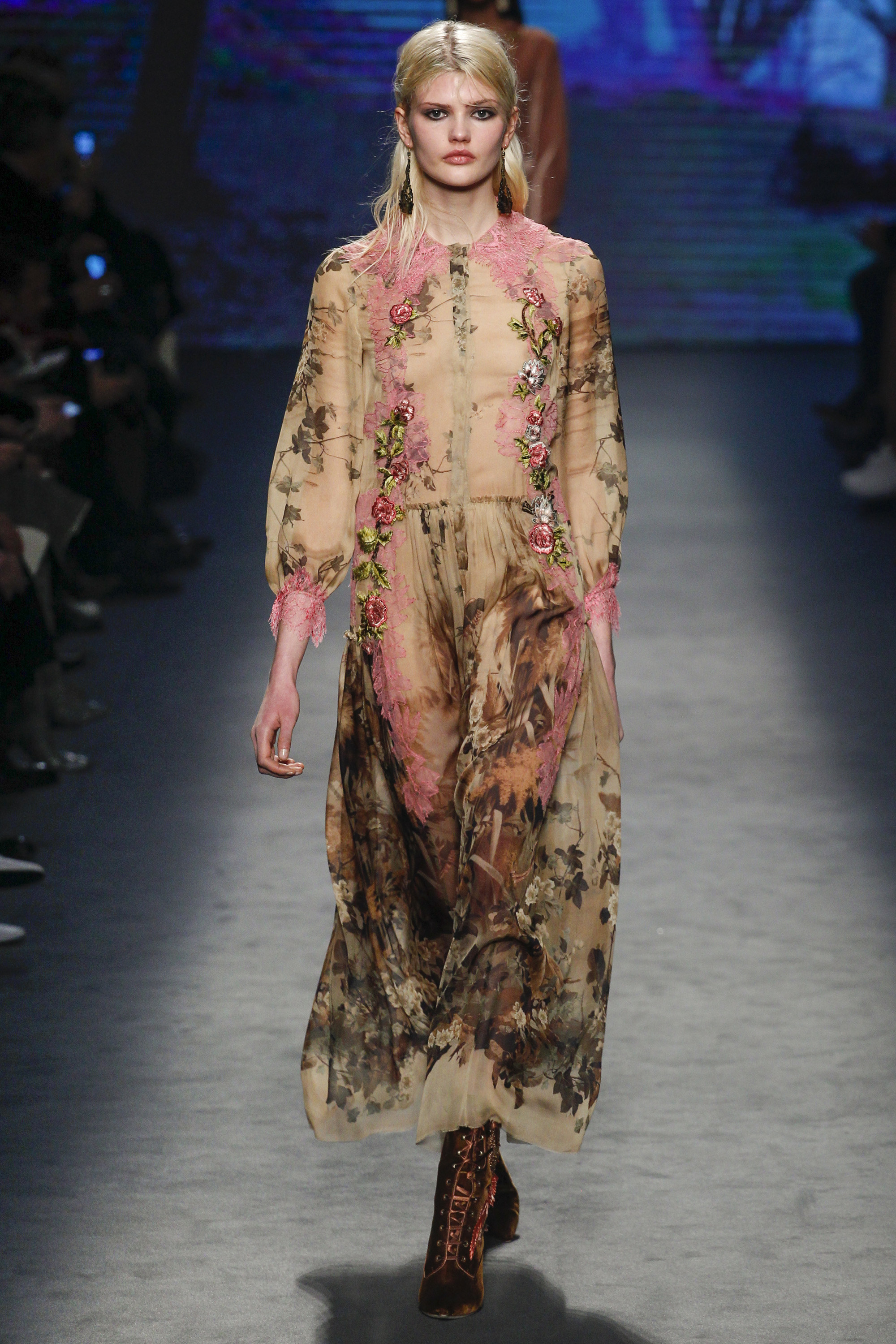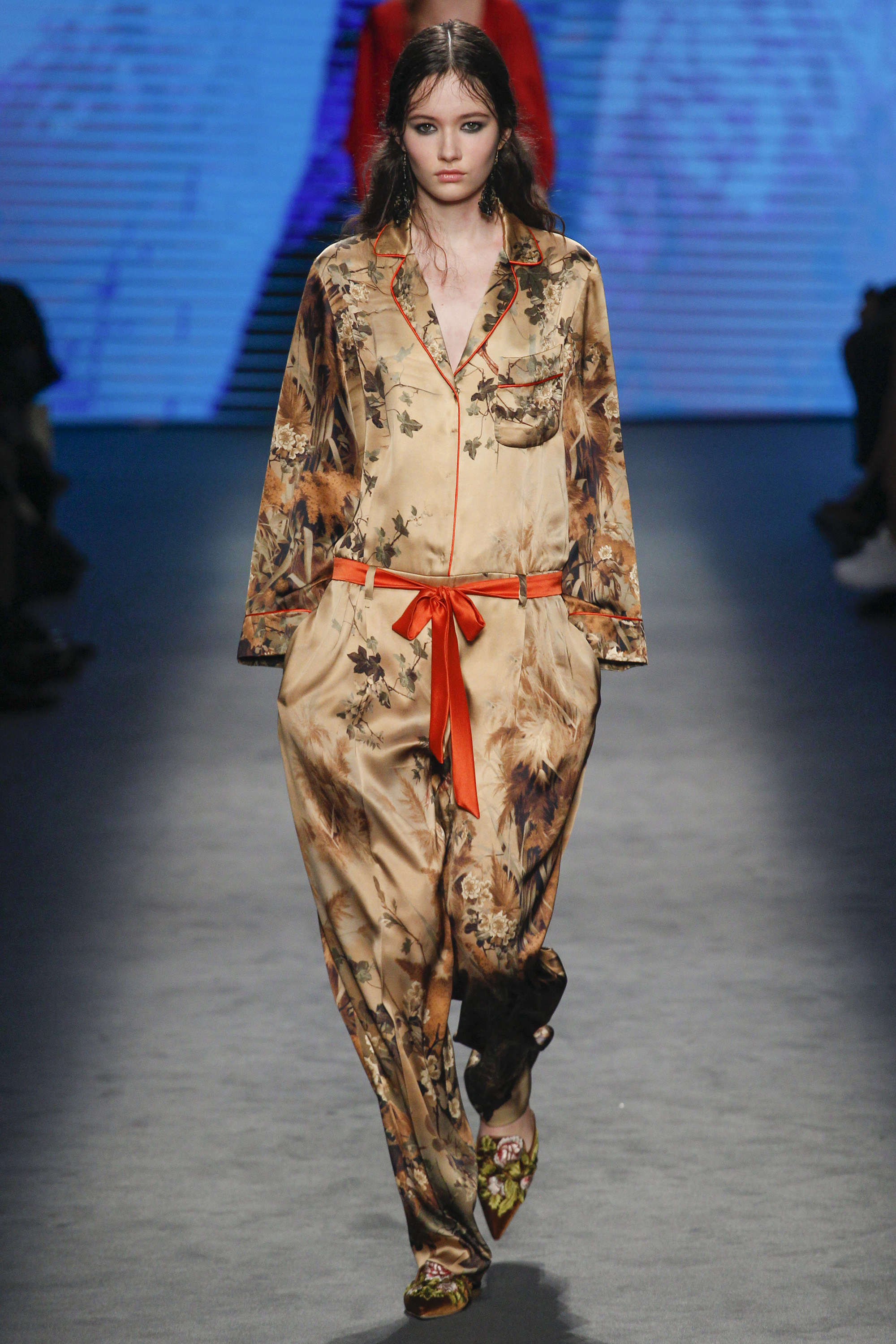 Florals—even for Fall—are no longer groundbreaking, but they were executed perfectly here on billowing shirt dresses with pink lace collars and roomy belted jumpsuits. Landscape patterns were also present on sheer watercolor-inspired button front shirts and trousers and pleated skirt gowns that unfortunately erred on the side of dowdiness.