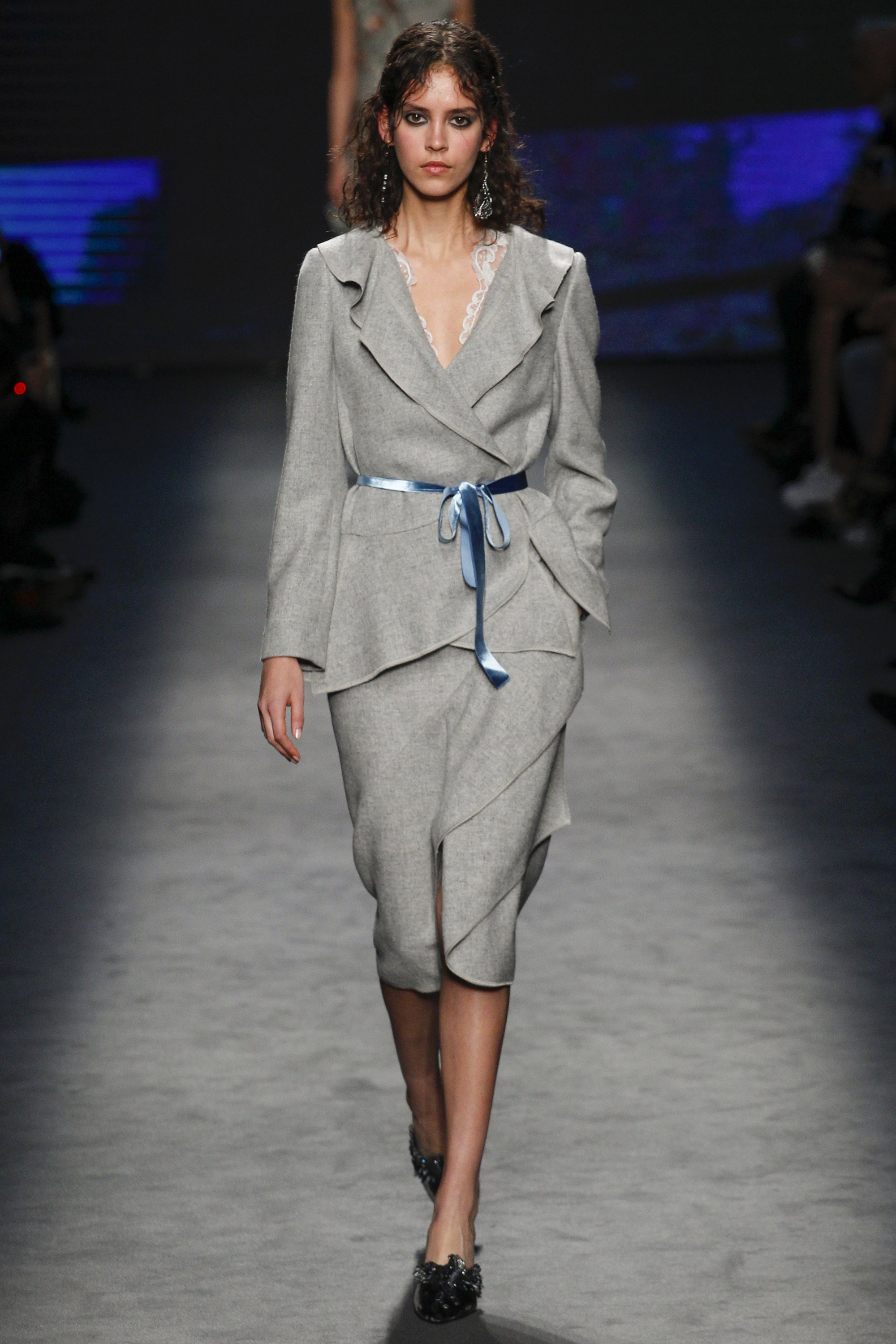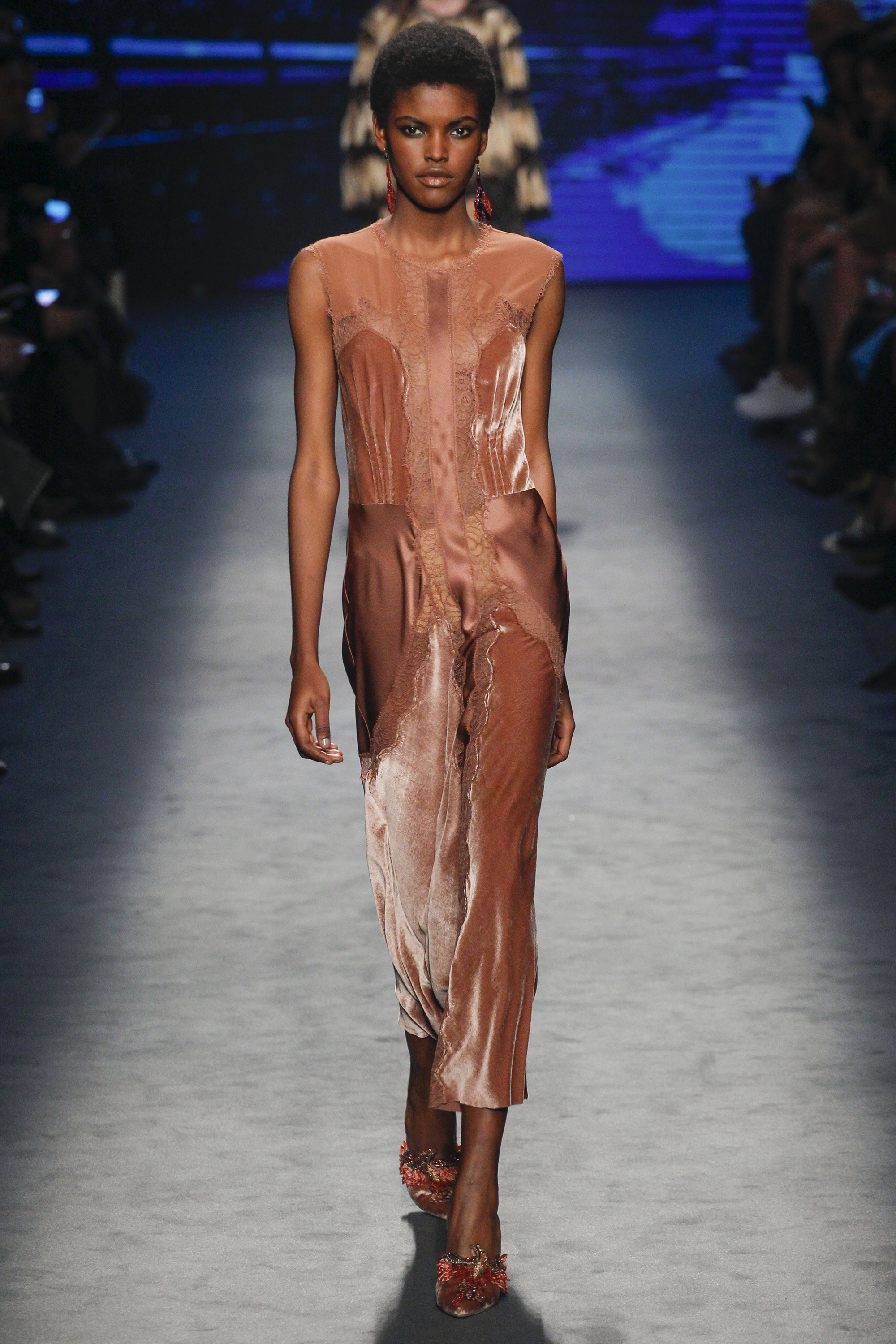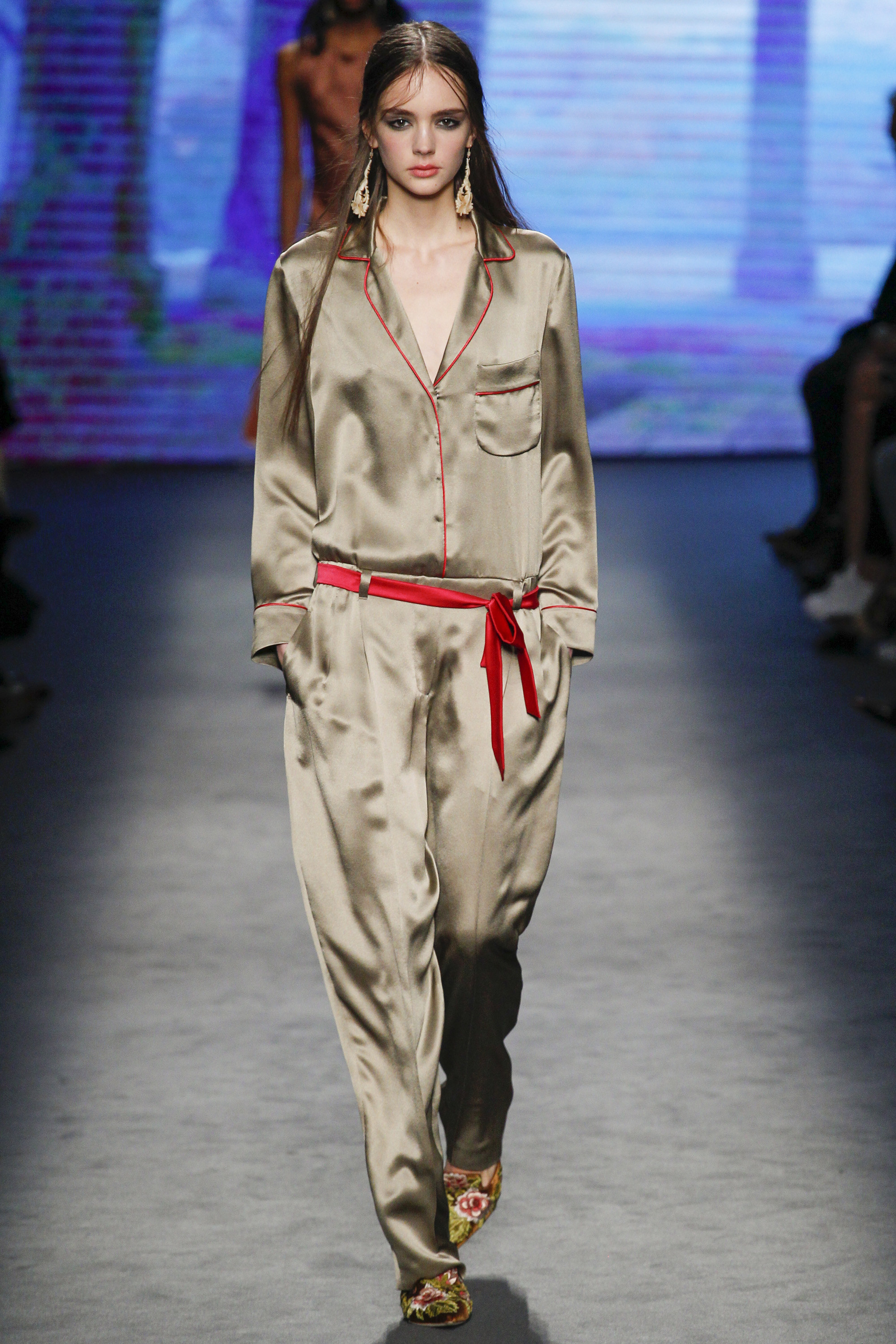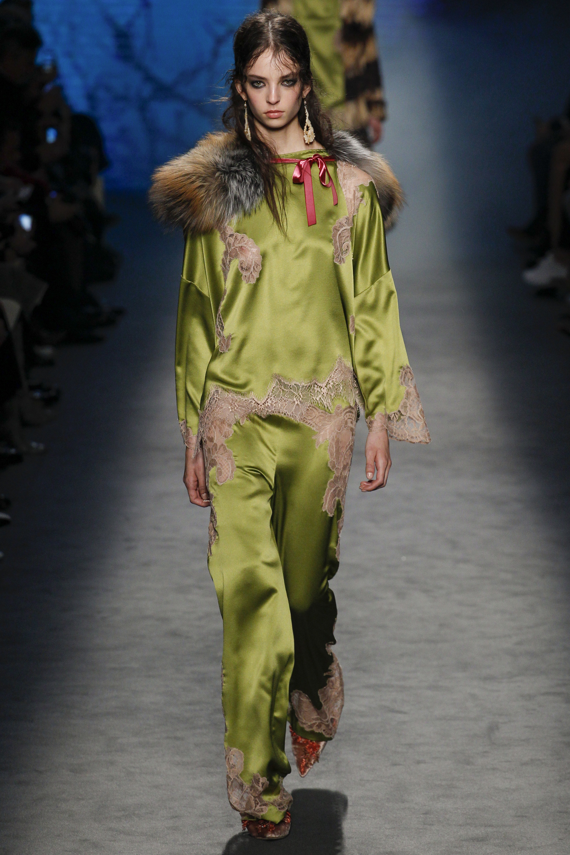 Lace, bedroom-ready pajamas, and fur were thrown in the mix right out of the gate: anchored with embellished takes on the slipper. Suiting was easy and functional, yet polished, while slip gowns were often paired with a cozy coat for a sample of real-time wear.