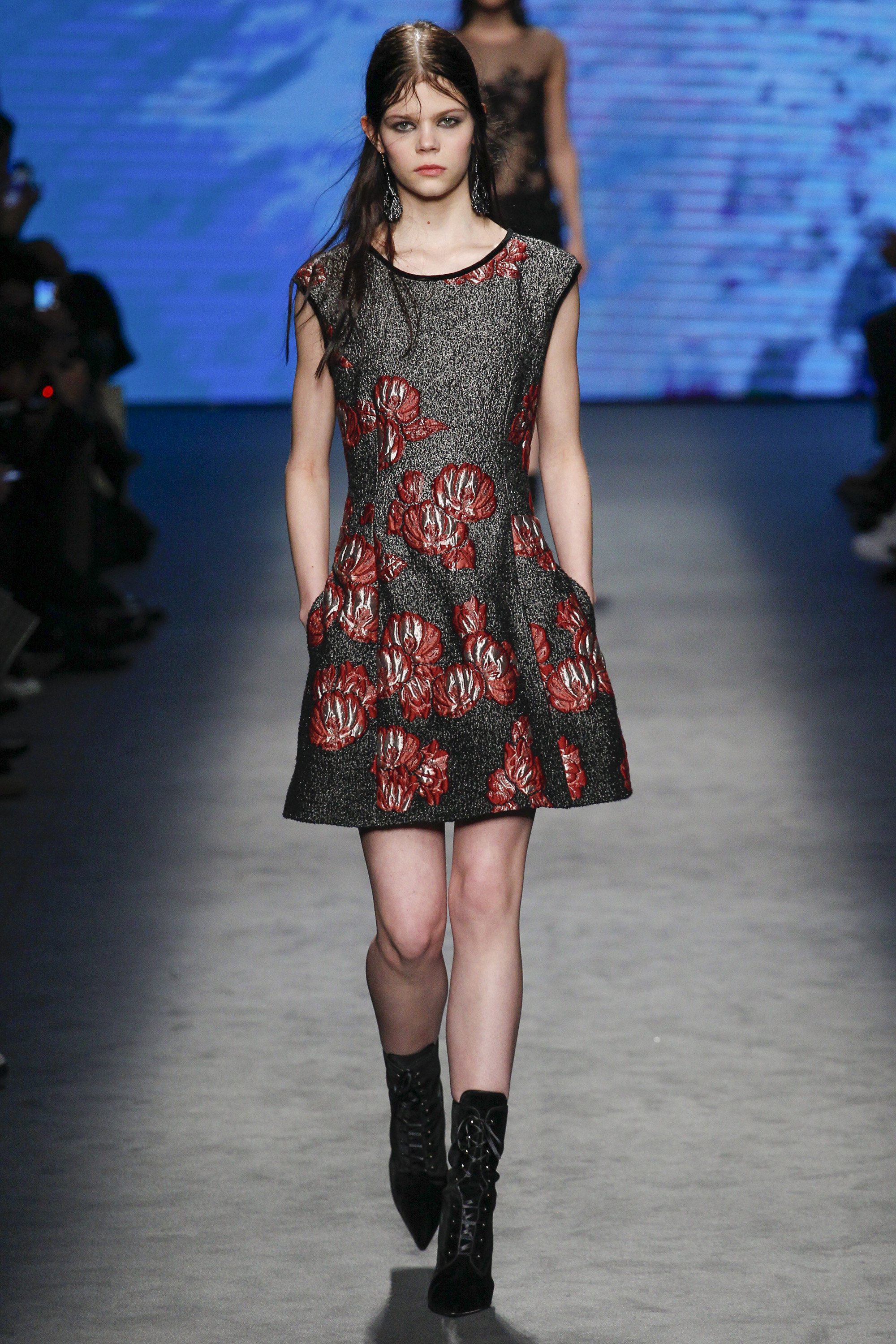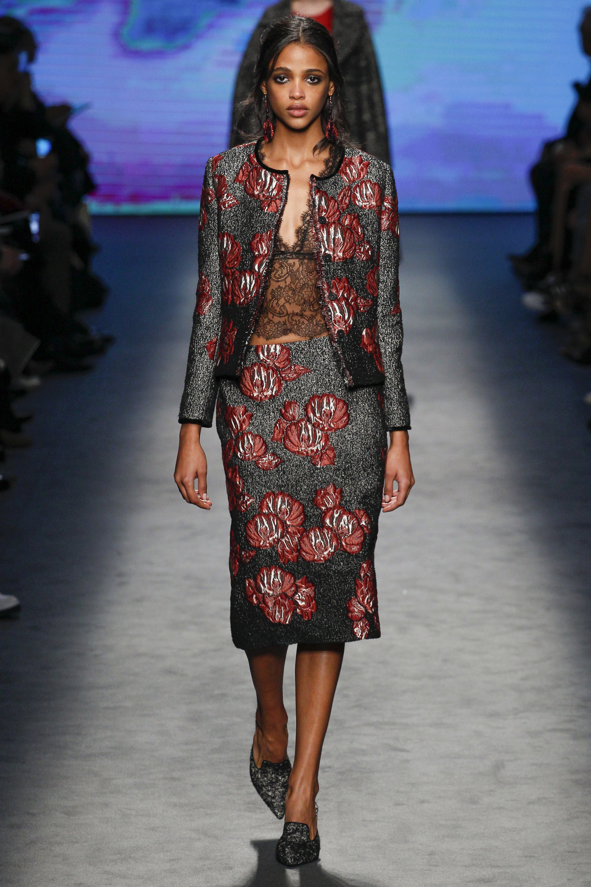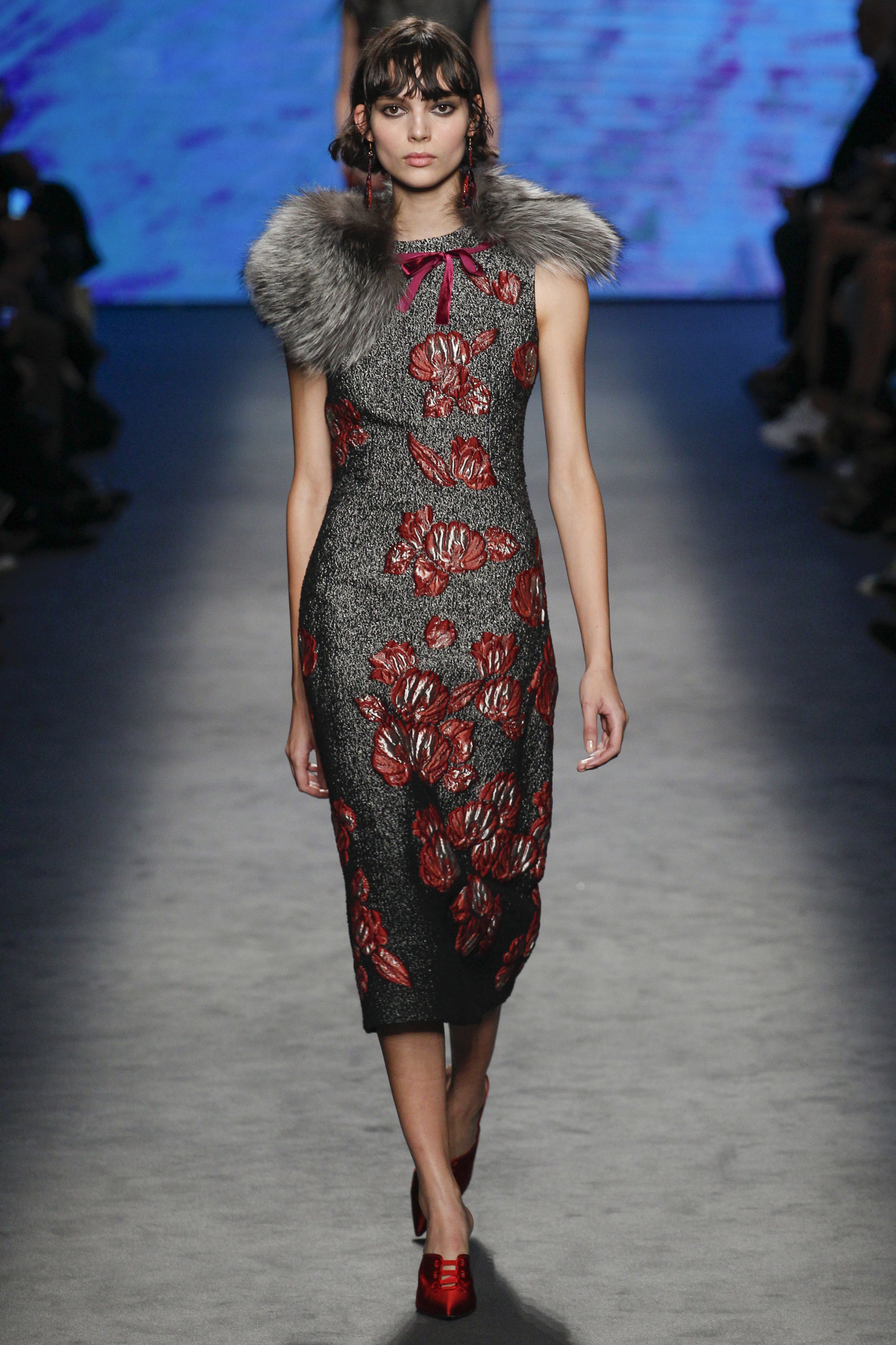 Embroidery was on display in the form of petals scattered on charming sheaths and flare dresses, a romantic coat, and retro-inspired skirt suit—in larger form as well on glossy gowns.