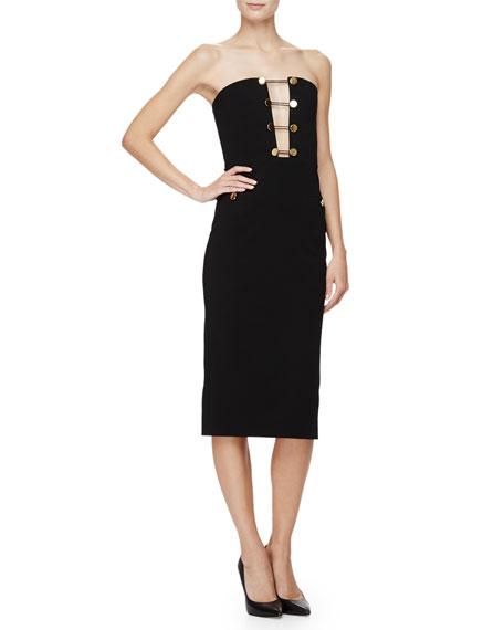Her strapless LBD features a plunging neckline framed by buttons, front slip pockets, a fitted silhouette, and straight hem.