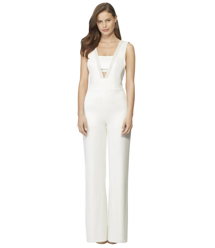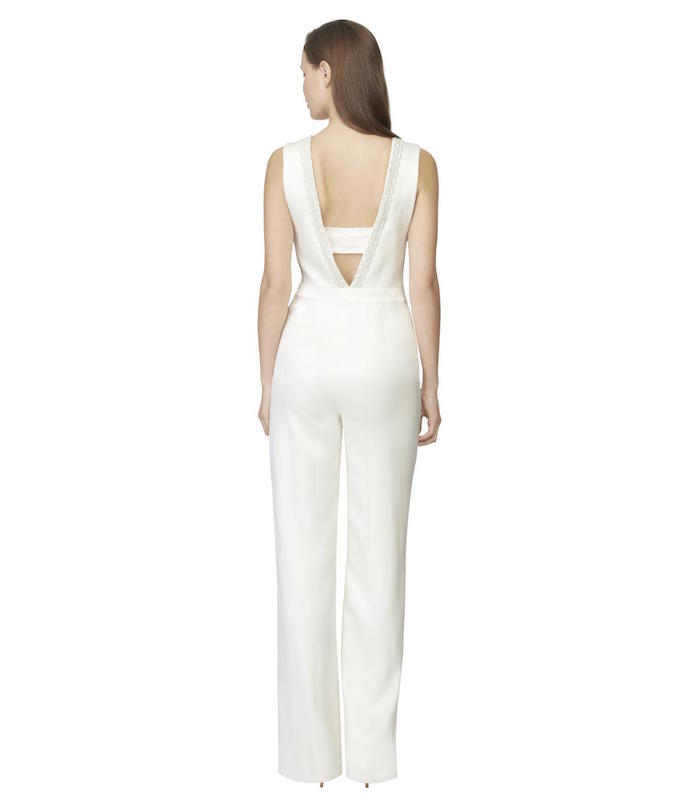 Her fully lined washed silk straight leg jumpsuit features a sleek matte sequin embroidery at the v-neckline.
