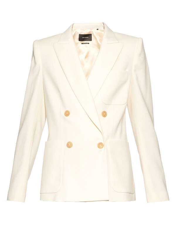 Her twill blazer features peak lapels, long sleeves, button-fastening cuffs, patch front and chest pockets, and a double-breasted silhouette.