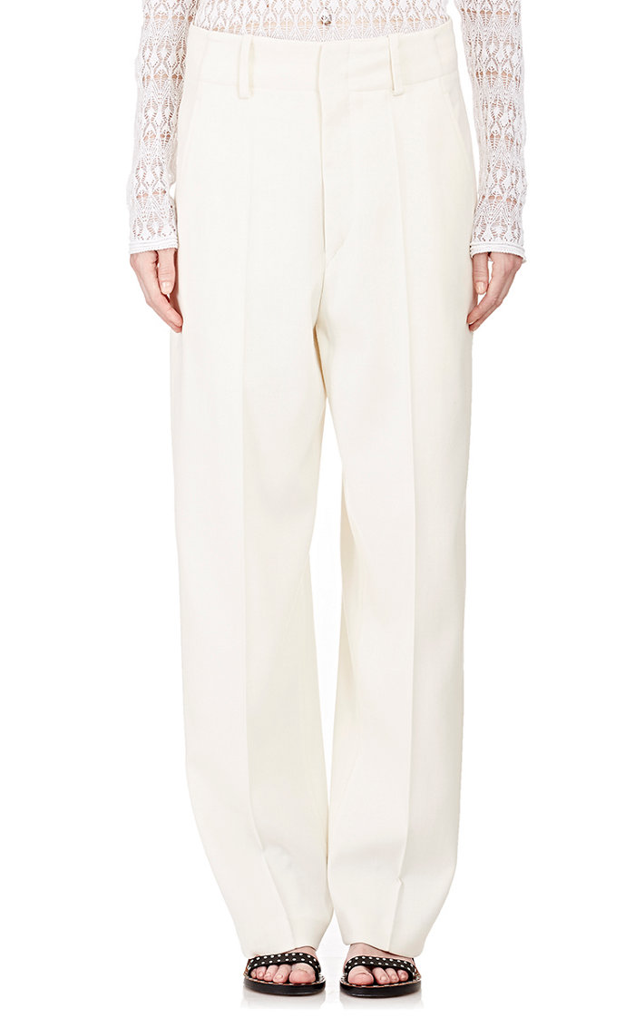 Her trousers boast a flat front, high waist, belt loops, quarter-top pockets, creased wide legs, a zip fly, and a double hook-and-bar closure.