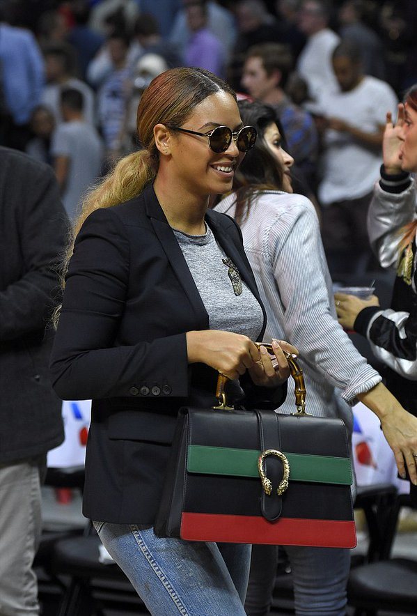 Beyoncé continued her love for Gucci while taking in the Los Angeles Clippers vs. Brooklyn Nets game courtside. For her night out, she donned $290 Sunday Somewhere Ned Sunglasses, a $844 Gucci Bird Embellished T-Shirt, and $3,500 Dionysus Large Paneled Leather Shoulder Bag from the iconic Italian fashion house:
