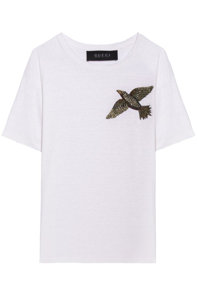 Her linen jersey t-shirt boasts short sleeves, distressed detailing, and a crystal and sequin bird motif.