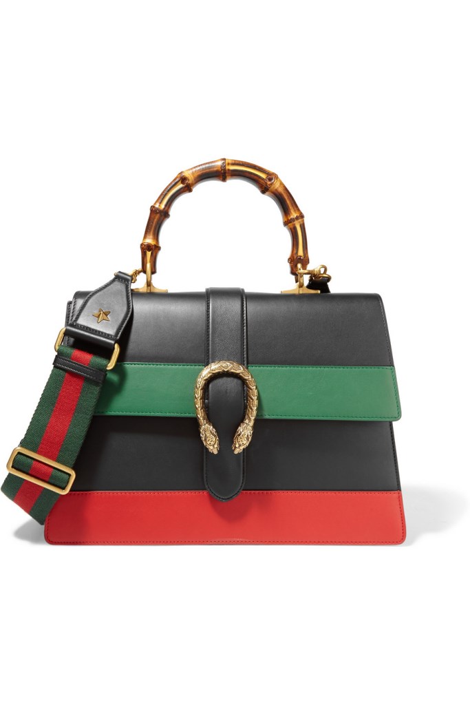 Her black, red, and green leather bag features a burnished gold tiger clasp, natural bamboo handle, and a second canvas strap.