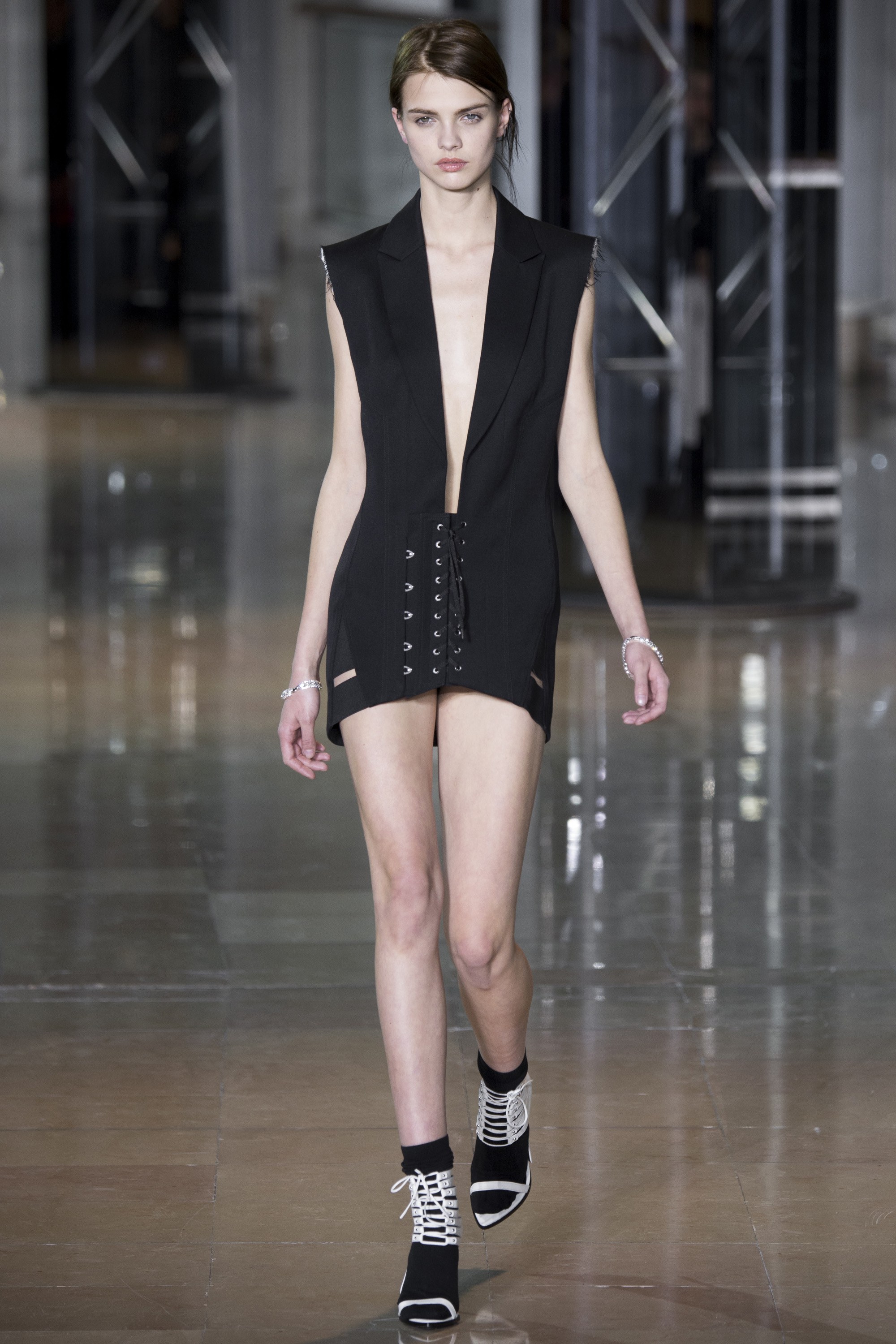 Always expect Anthony Vaccarello to pump up the volume on sex appeal. It’s somewhat hard to believe that the brand has only been around for 7 years considering the celebrity diehards who consistently rock his designs: Diane Kruger, Rosie Huntington-Whitely, and Nicole Ritchie plus: if you consider his hand at Versus Versace, the celebrity number jumps to include Ciara and Cassie amongst others. This time around, Anthony Vaccarello opted for corsetry detailing defined at the hip instead of the waist. It worked! Models were still characteristically sexy, but with a little bit more ease.
