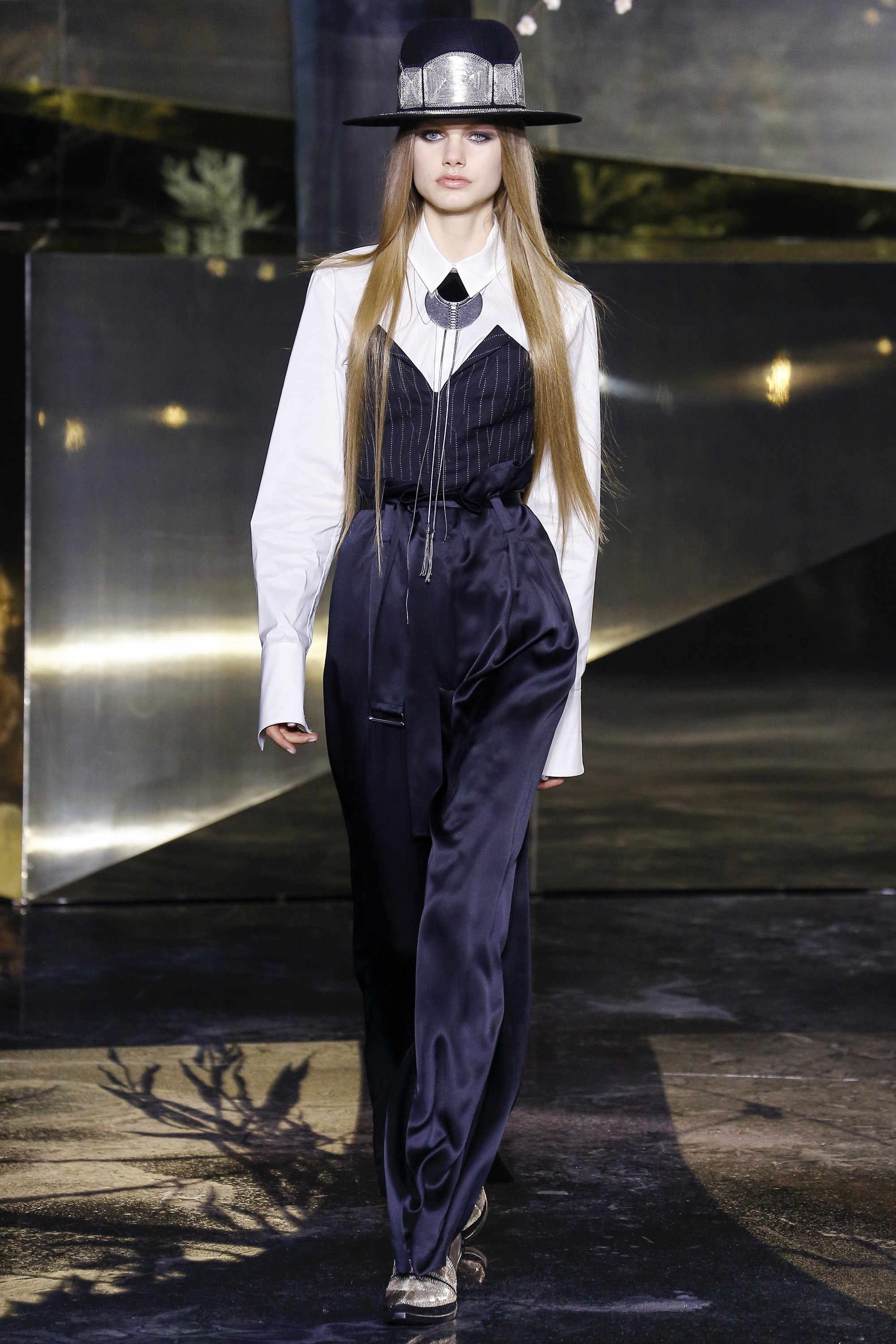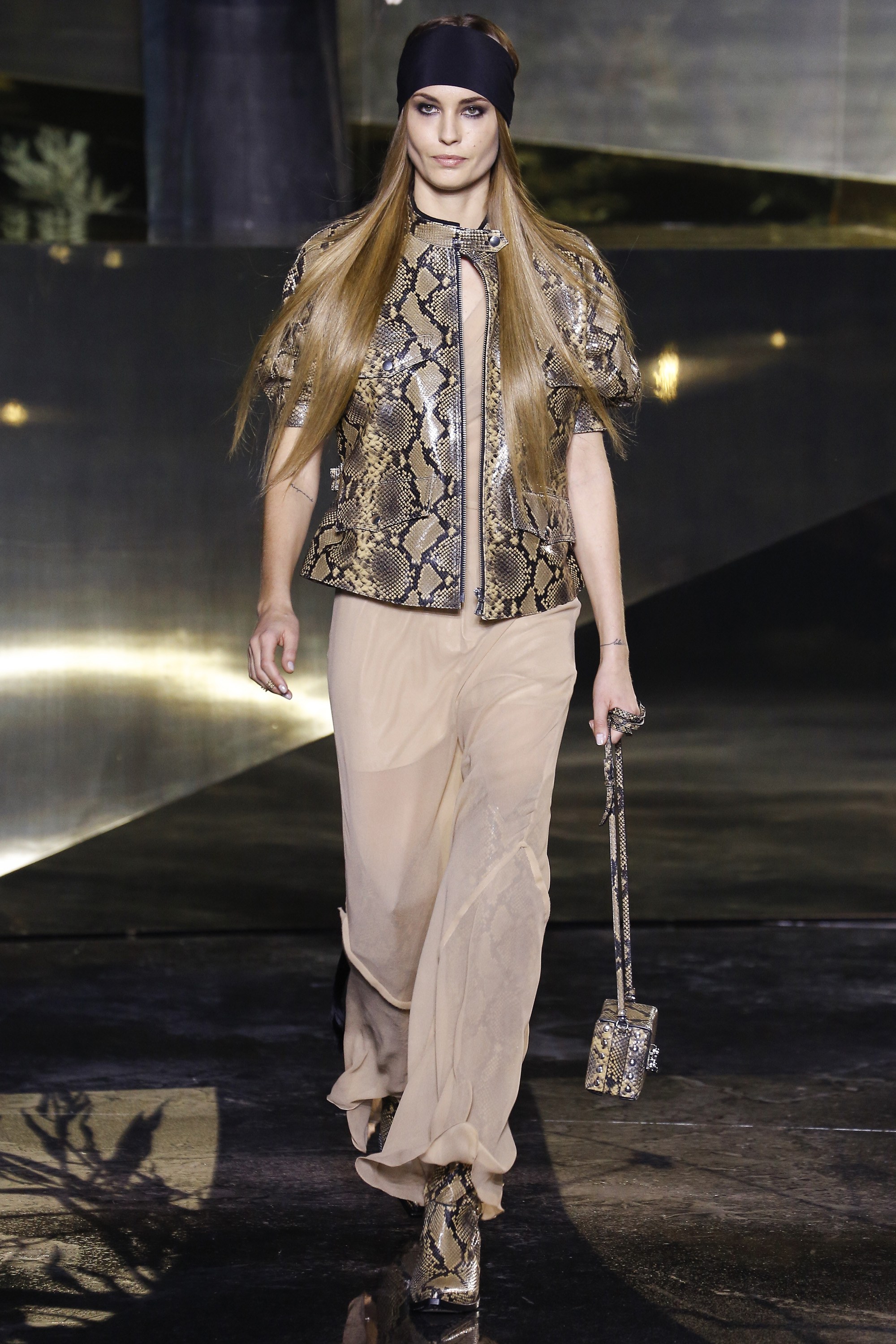 A taste of the exotic and gesture to modernity were given with python thigh-high boots, cropped trousers, a short-sleeve moto jacket, and waist-cinching belt in both natural and red hues. Wide-brimmed hats with intricate beading topped off each look.