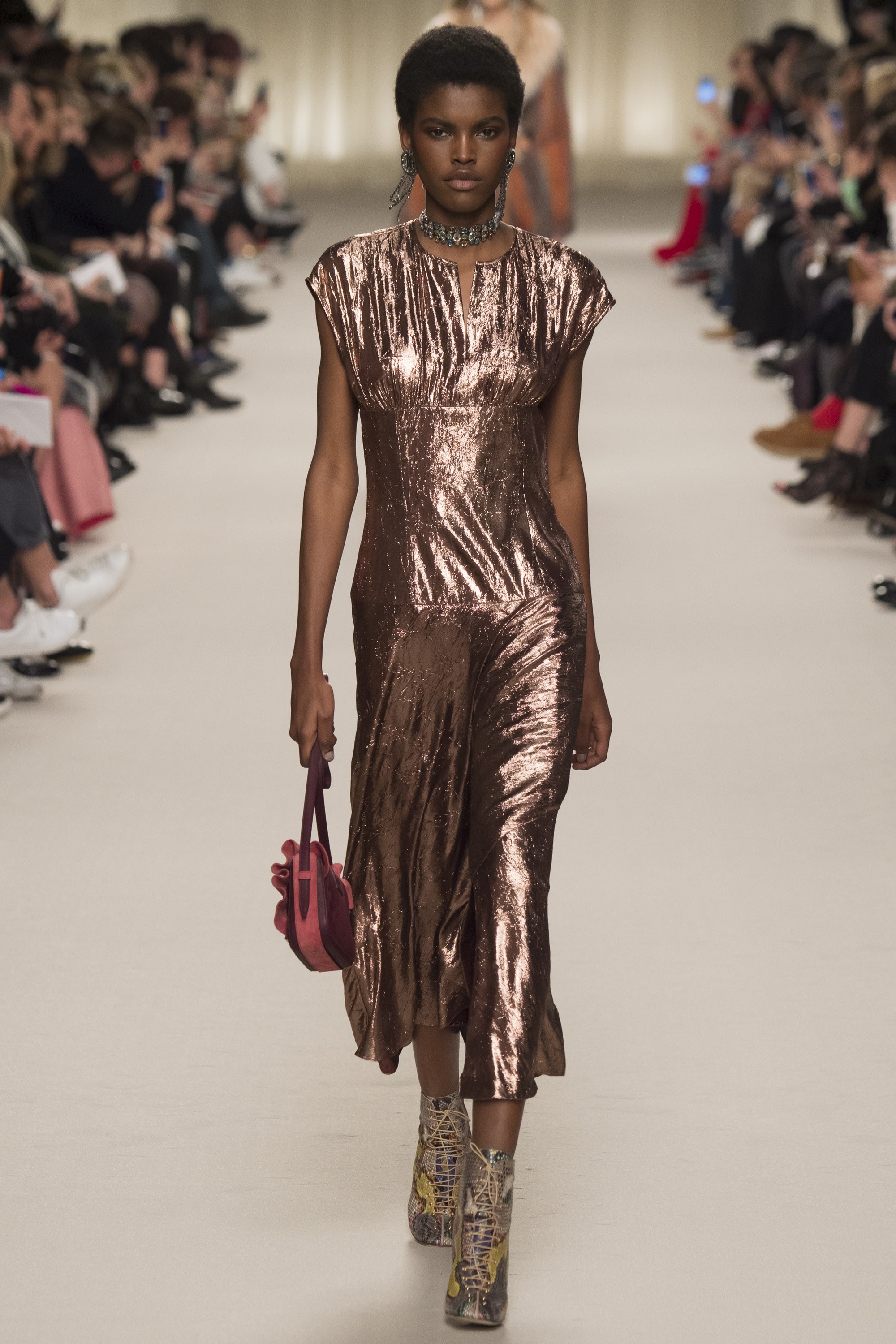 Dresses did not hug the body too tight nor fall too lose; random shades of metallics livened up the collection, whether in dresses, separate attire or in large fur coats of burnt oranges and neutrals.