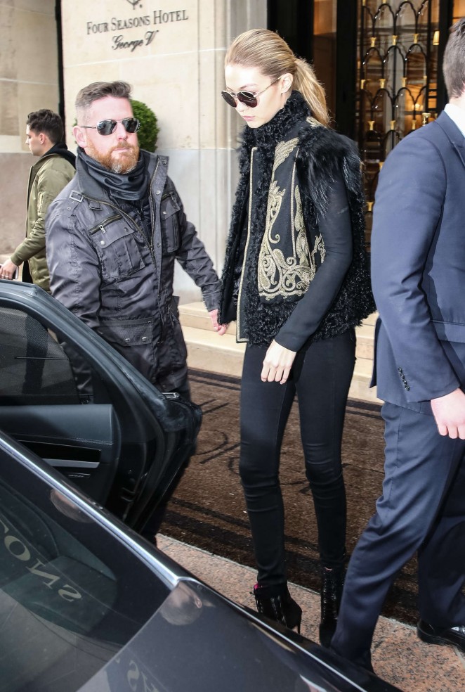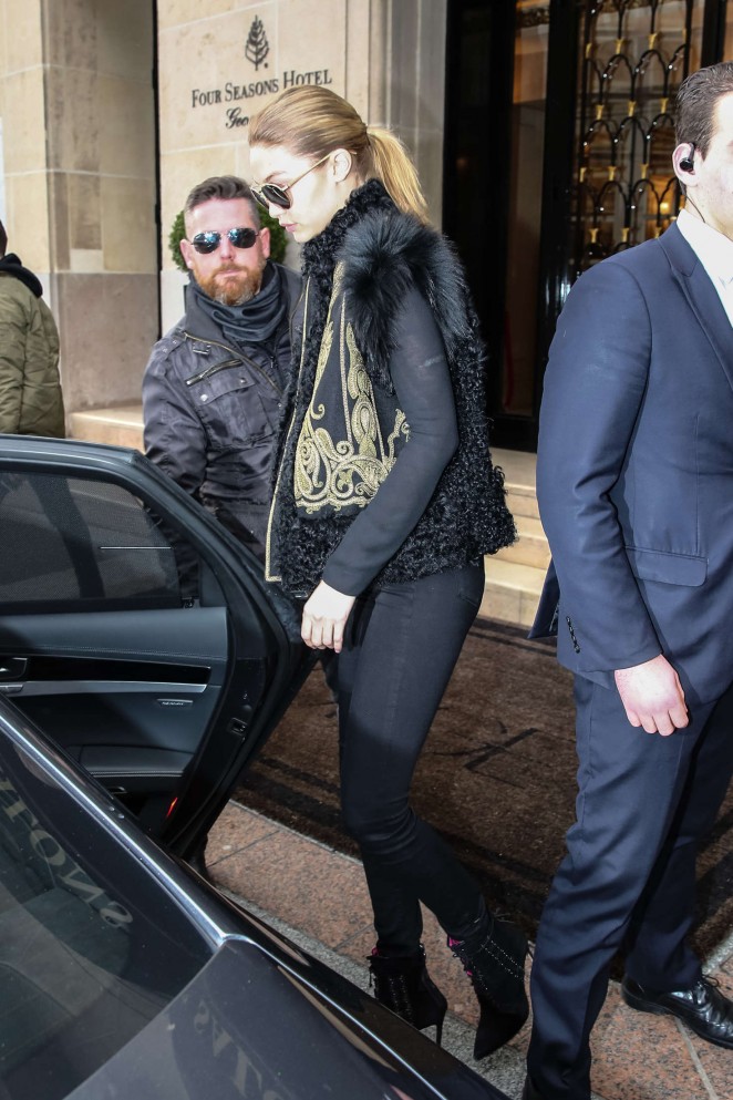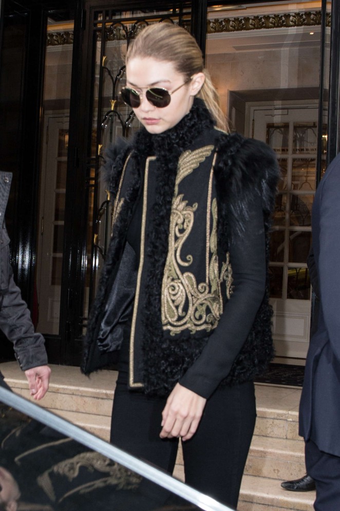 Gigi Hadid was spotted out and about in Paris, donning a $5,270 Etro Embroidered Shearling and Wool Vest and $639 Oscar Tiye Black Samira Suede Boots: