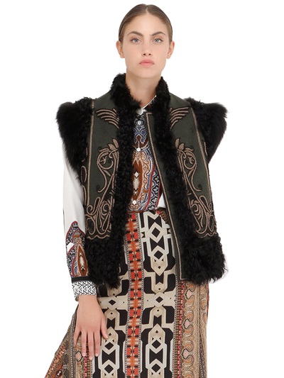 Her vest features an embroidered front and back panels, shearling trim, and Murmansky fur accents.
