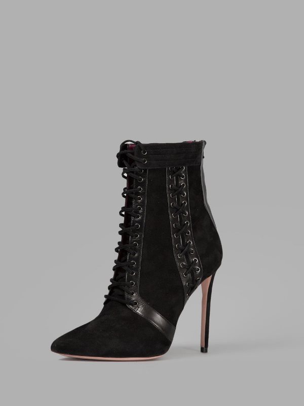 Her black suede boots boast a lace-up silhouette to both the front and side, back zip closures, pointed toes, and 4.3″ heels