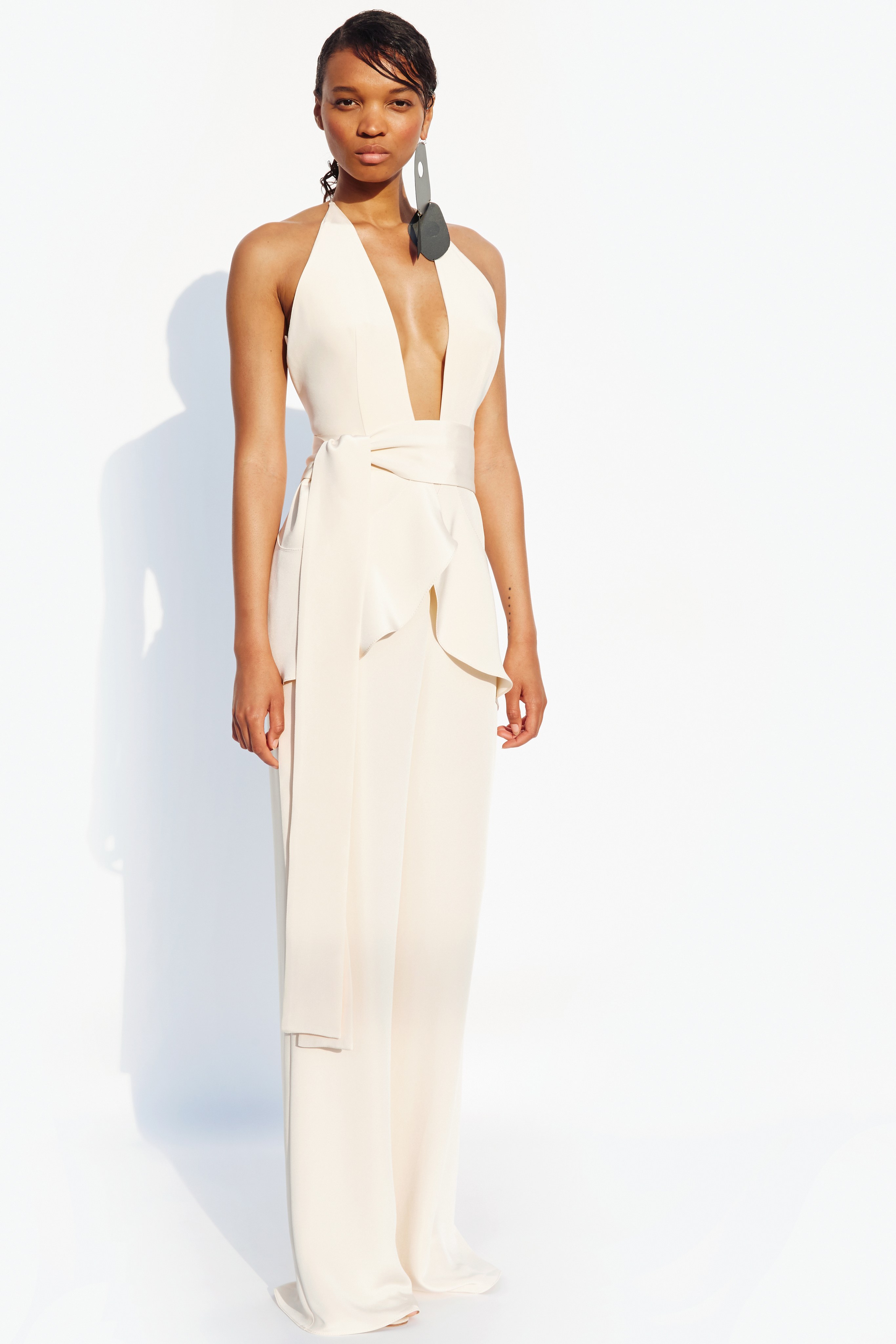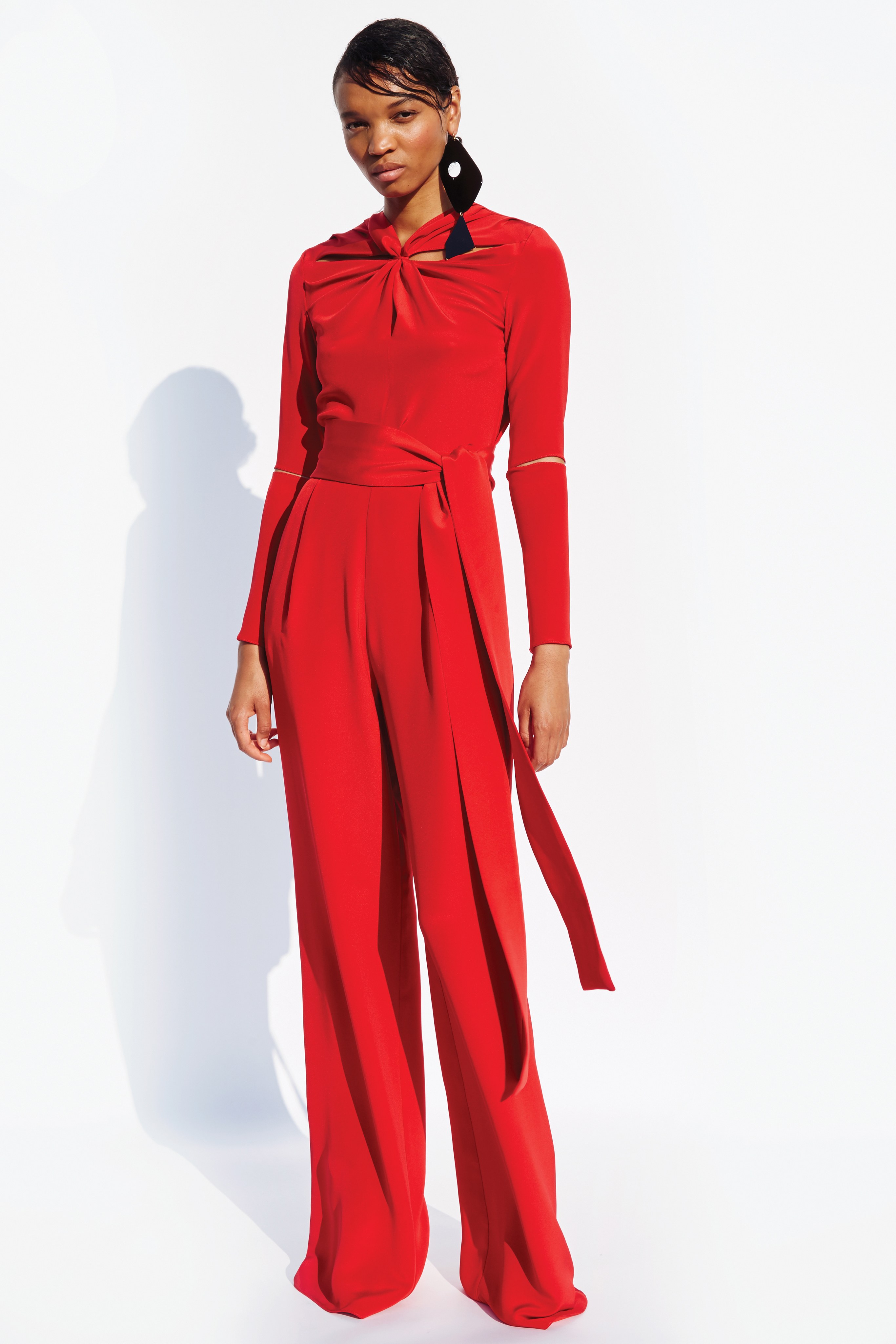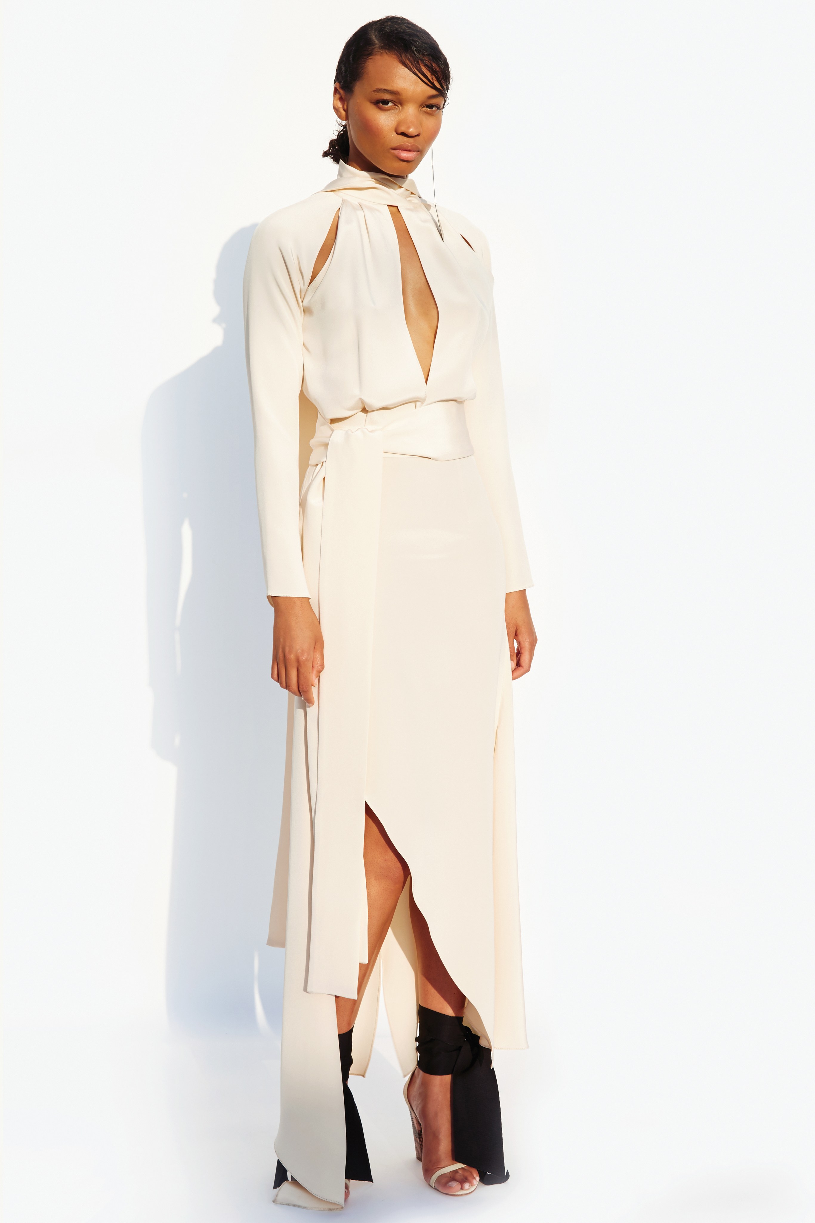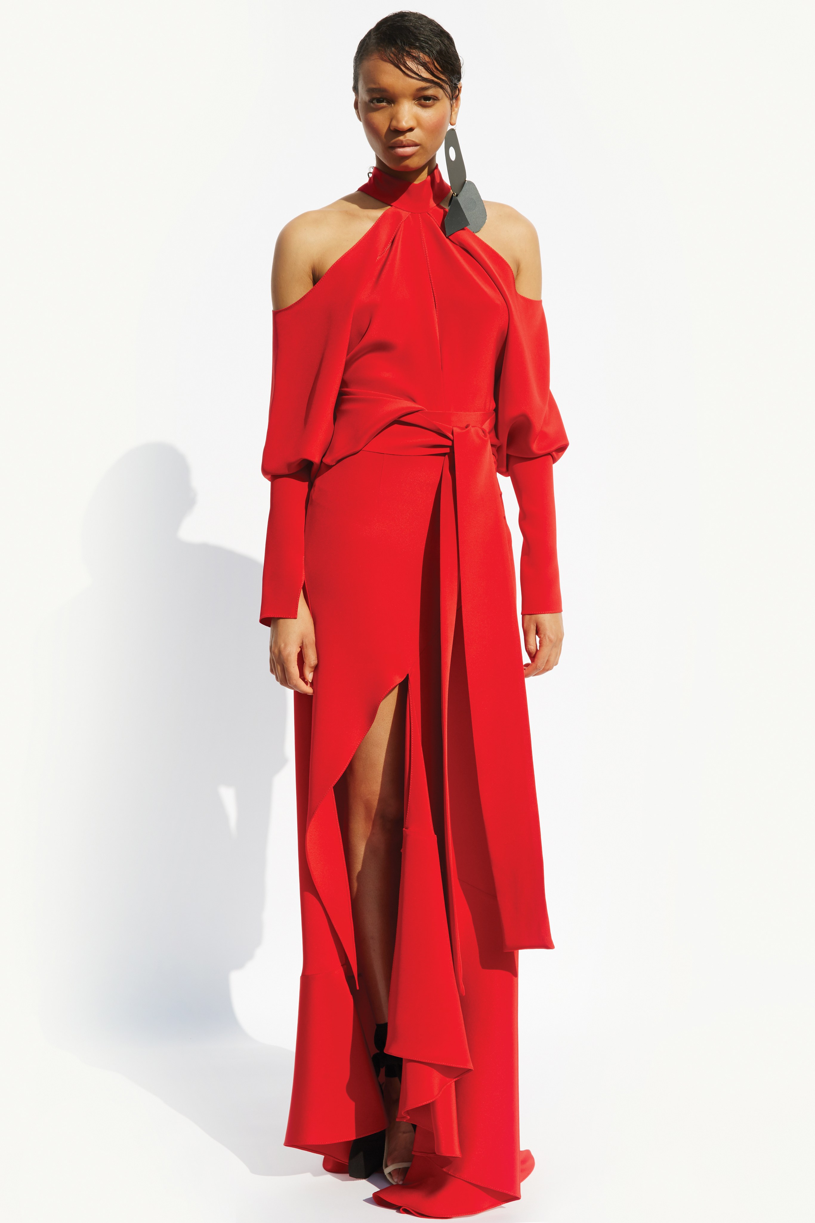 The romance and glamour of dinners and dances in South America in the 60’s and 70’s were Juan Carlos Obando’s inspiration for Fall 2016: the kind he would have witnessed as a child in Barranquilla, Colombia as he isn’t yet forty. Grace and gesture are signatures of his brand and he continued with that love of flow and motility by way of undulating ruffles, thigh-high slits, tie-waists, and cutout shoulders.