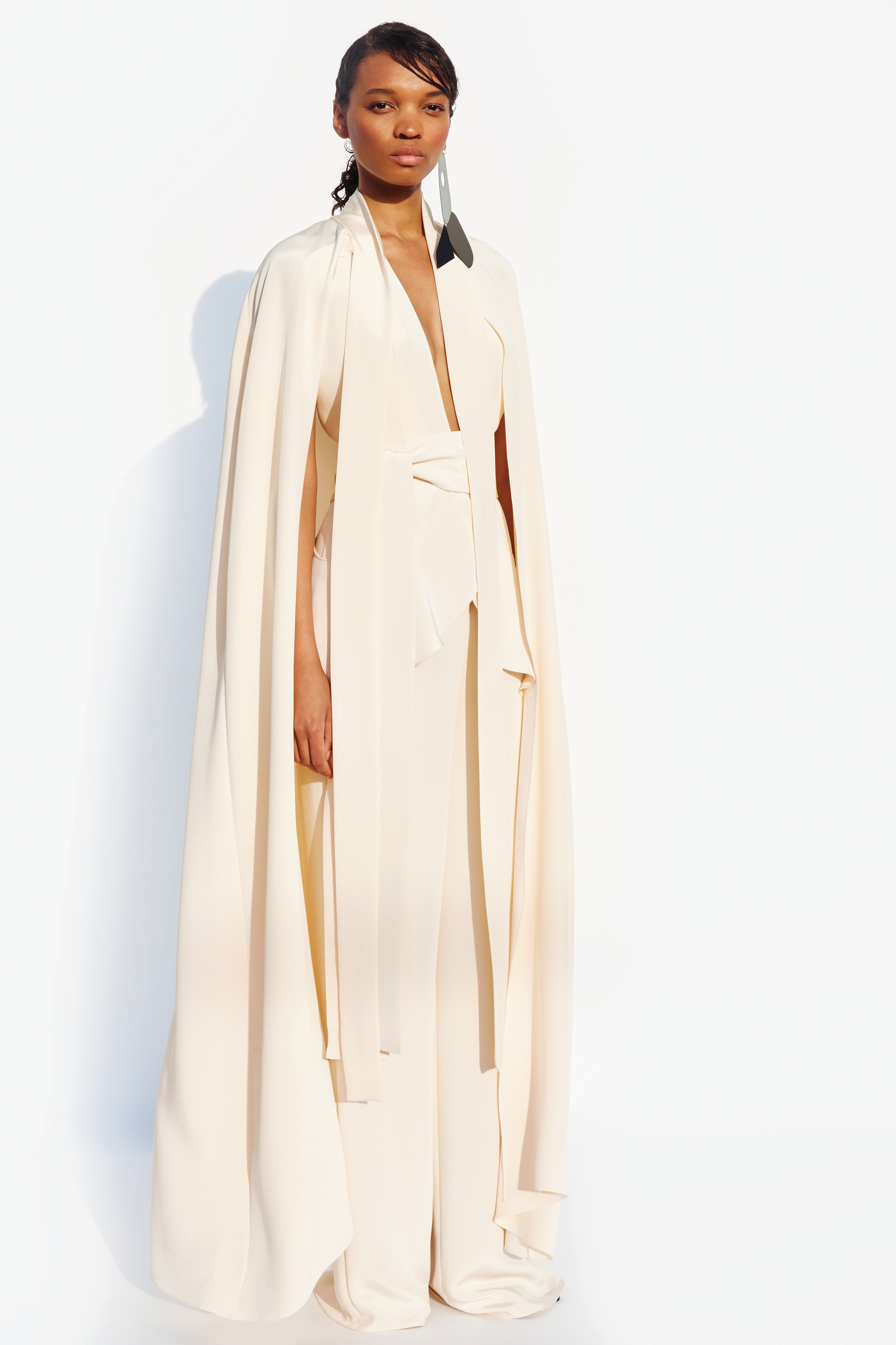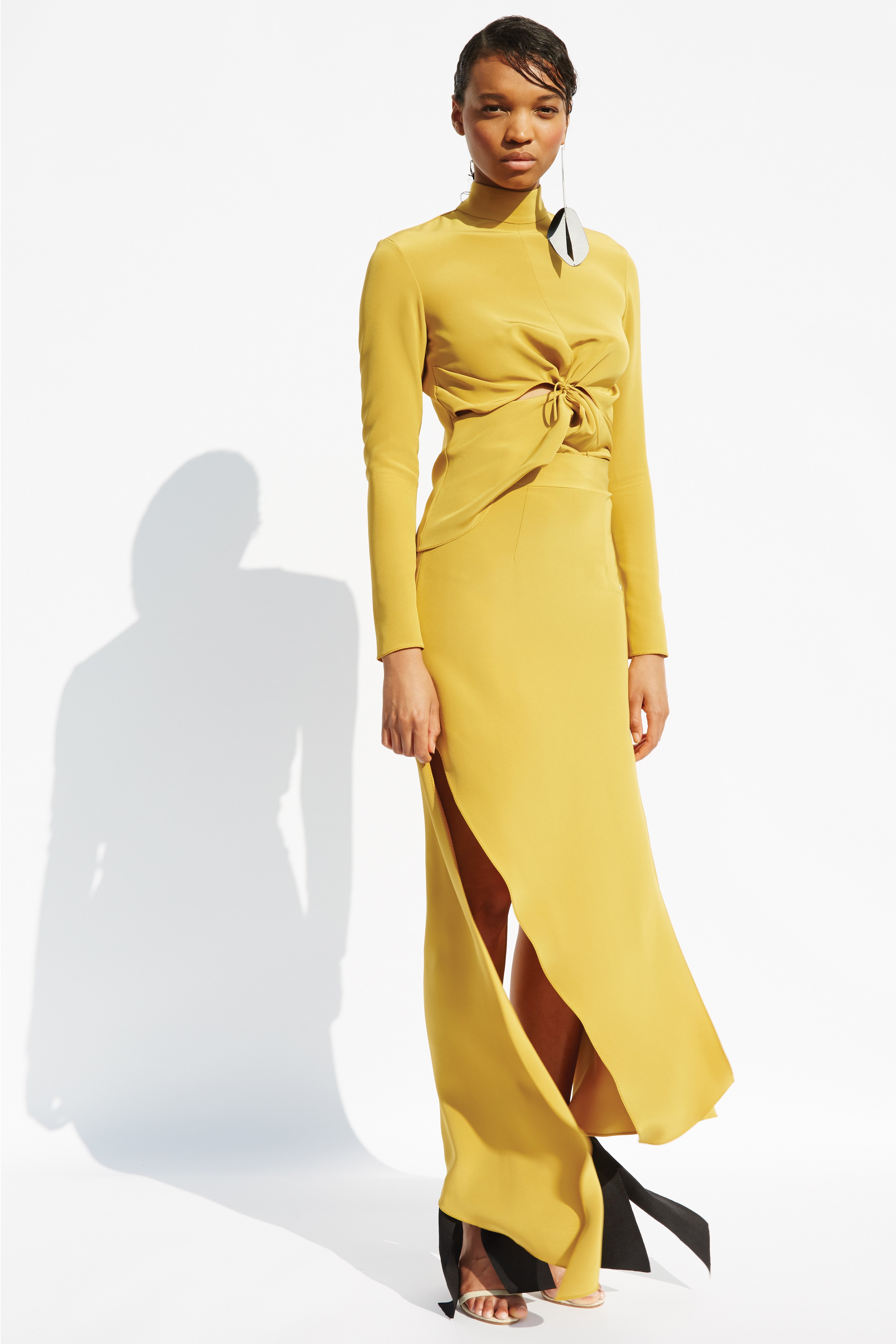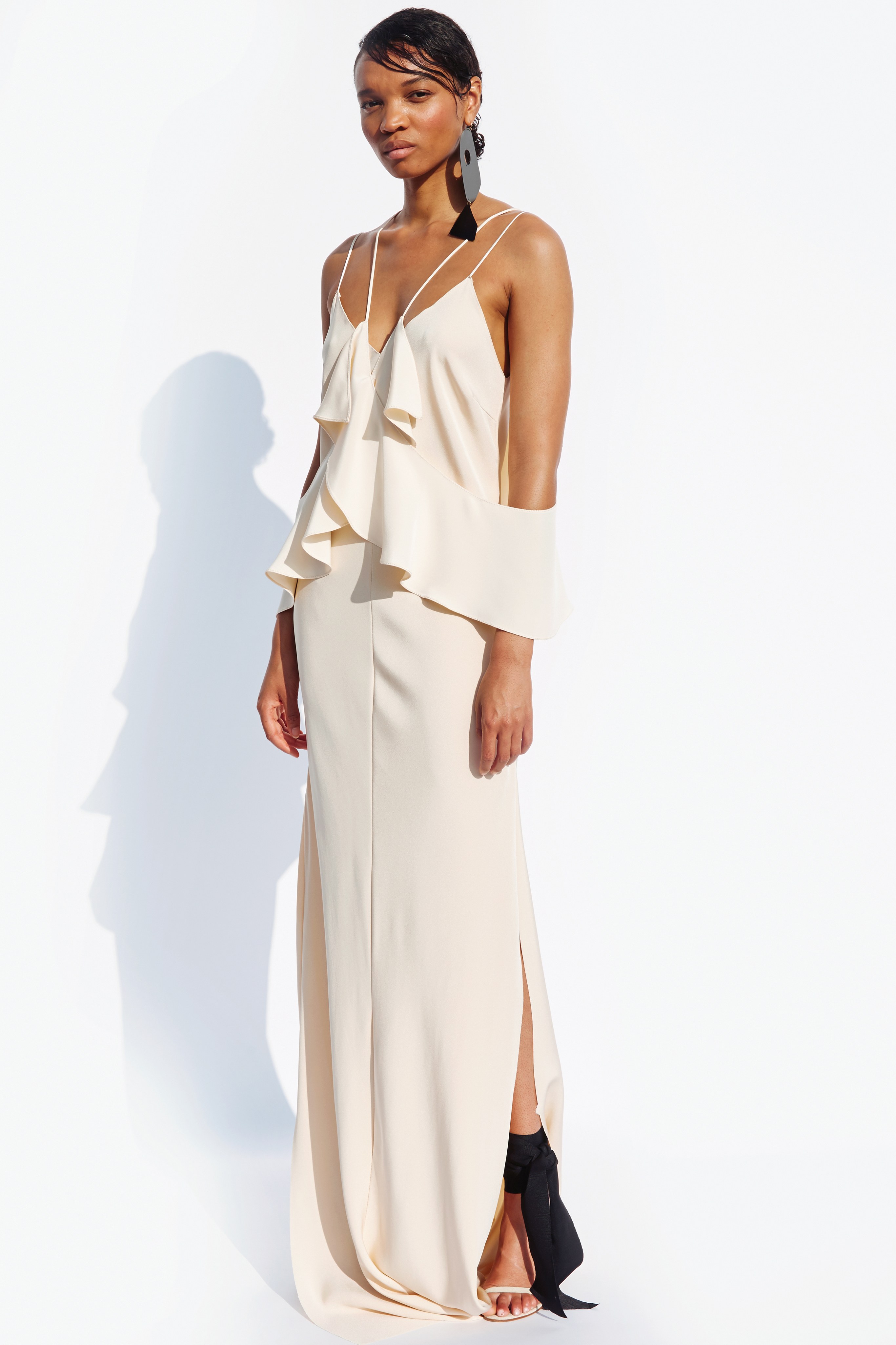 The romance and glamour of dinners and dances in South America in the 60’s and 70’s were Juan Carlos Obando’s inspiration for Fall 2016: the kind he would have witnessed as a child in Barranquilla, Colombia as he isn’t yet forty. Grace and gesture are signatures of his brand and he continued with that love of flow and motility by way of undulating ruffles, thigh-high slits, tie-waists, and cutout shoulders.