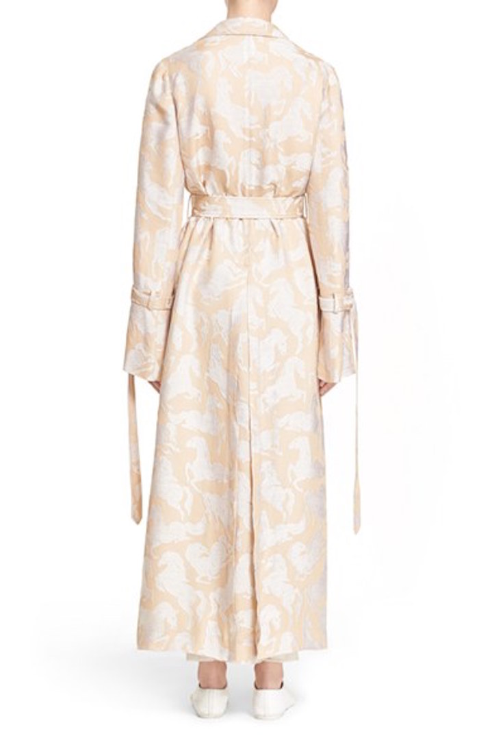 Her long sleeve trench features a running-horse pattern with exaggerated belts at the bell sleeves and waist.