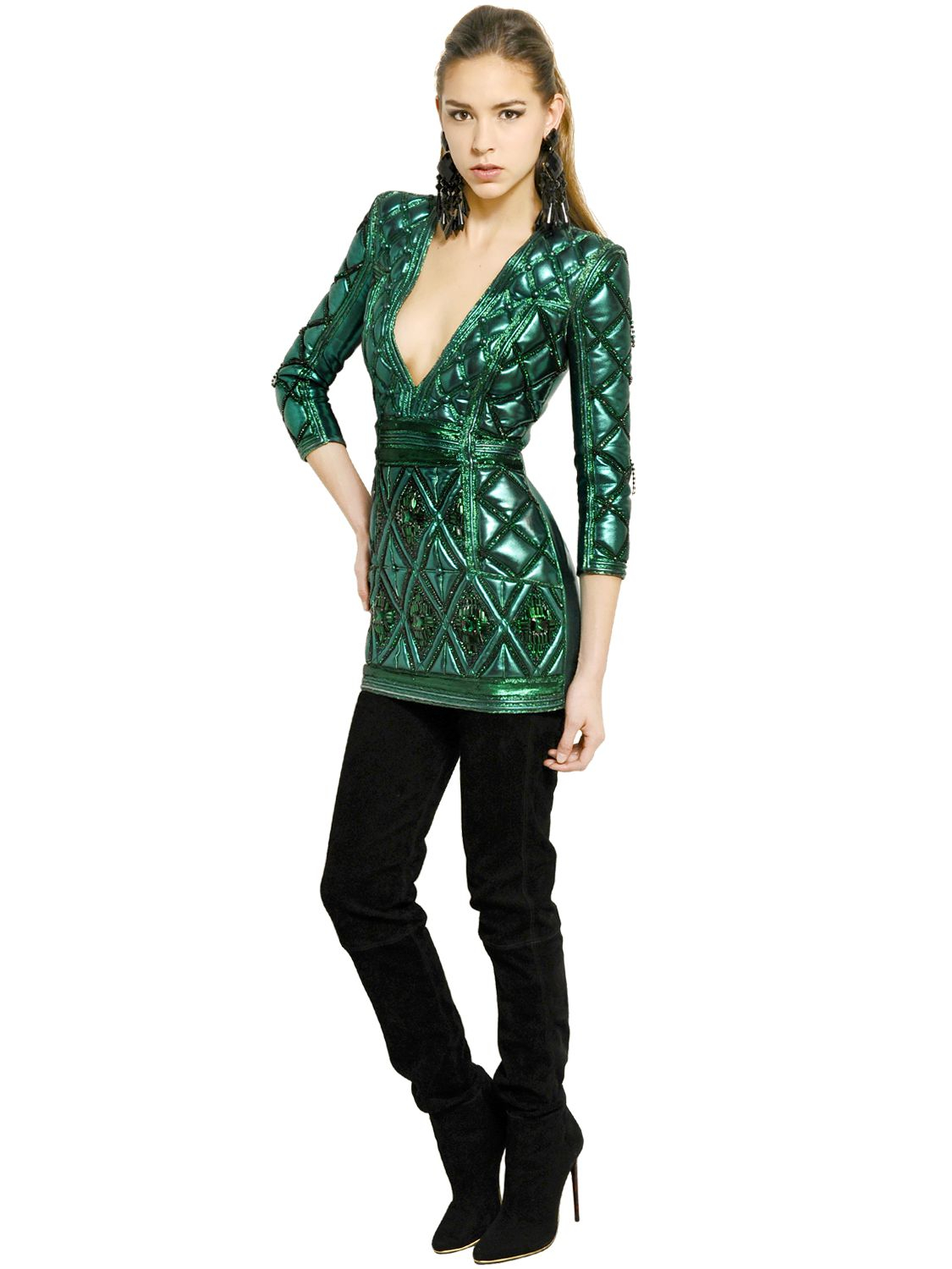 The model turned up with her beau Diddy in a $12,534 Balmain Green Embroidered Laminated Nappa Dress and Christian Louboutin So Kate Black Pointed Pumps. She also flaunted a chic low ponytail and flawless makeup.