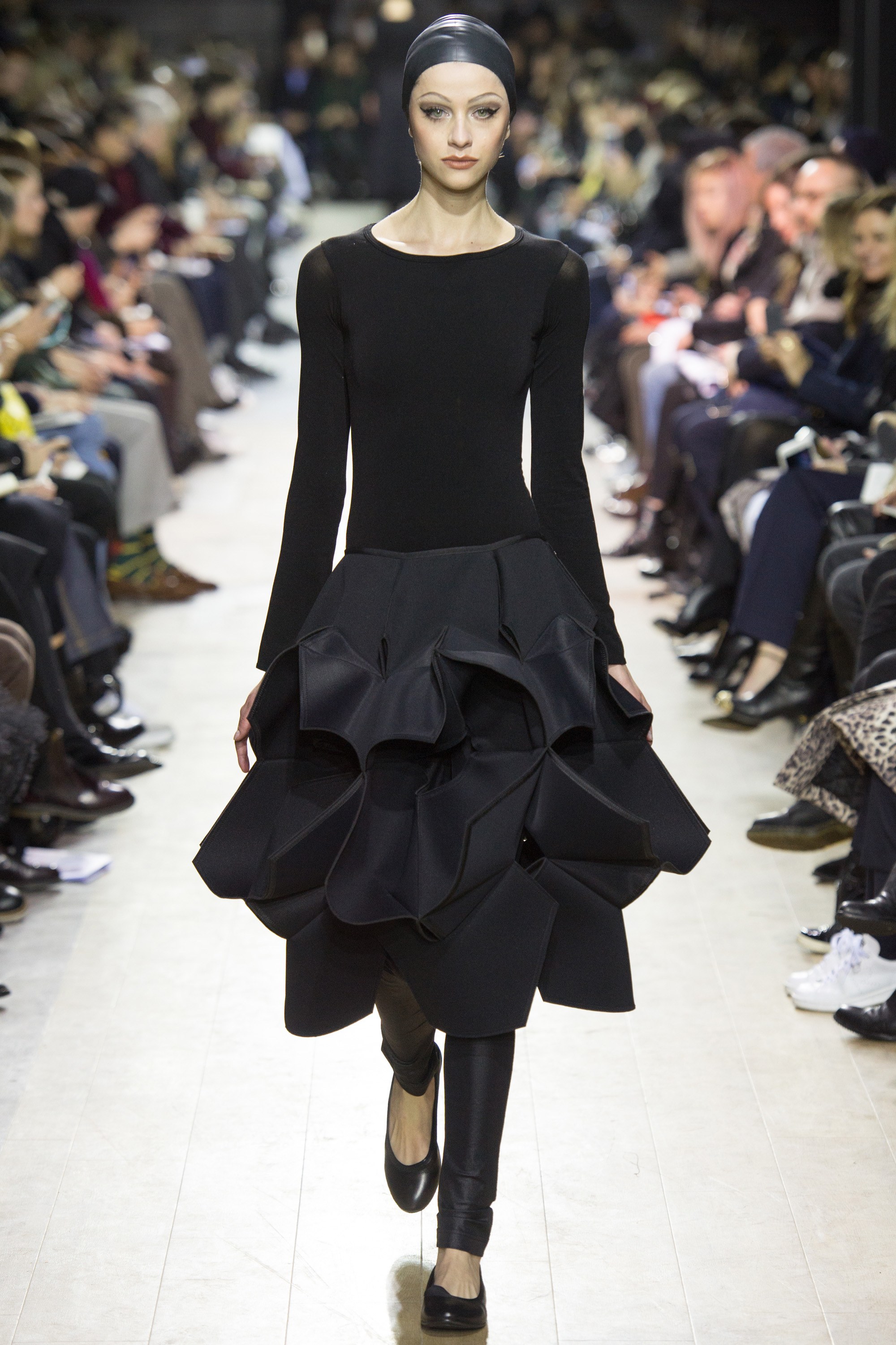 Geometry was put to the test at Junya Watanabe, where pieces literally looked as if they had come from a 3-D computerized model. On the other hand, skirts and dresses constructed out of industrial neoprene took reference from Watanabe’s native Japan and its cherished origami art form.