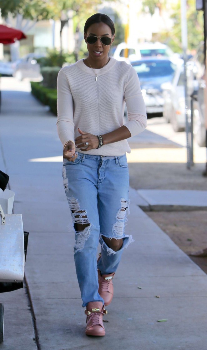Kelly Rowland looked radiant in Los Angeles while rockin’ a white sweater, distressed jeans and $890 Buscemi Gold Tone Clasp Detail Bubble Gum Pink Lace Up Sneakers: