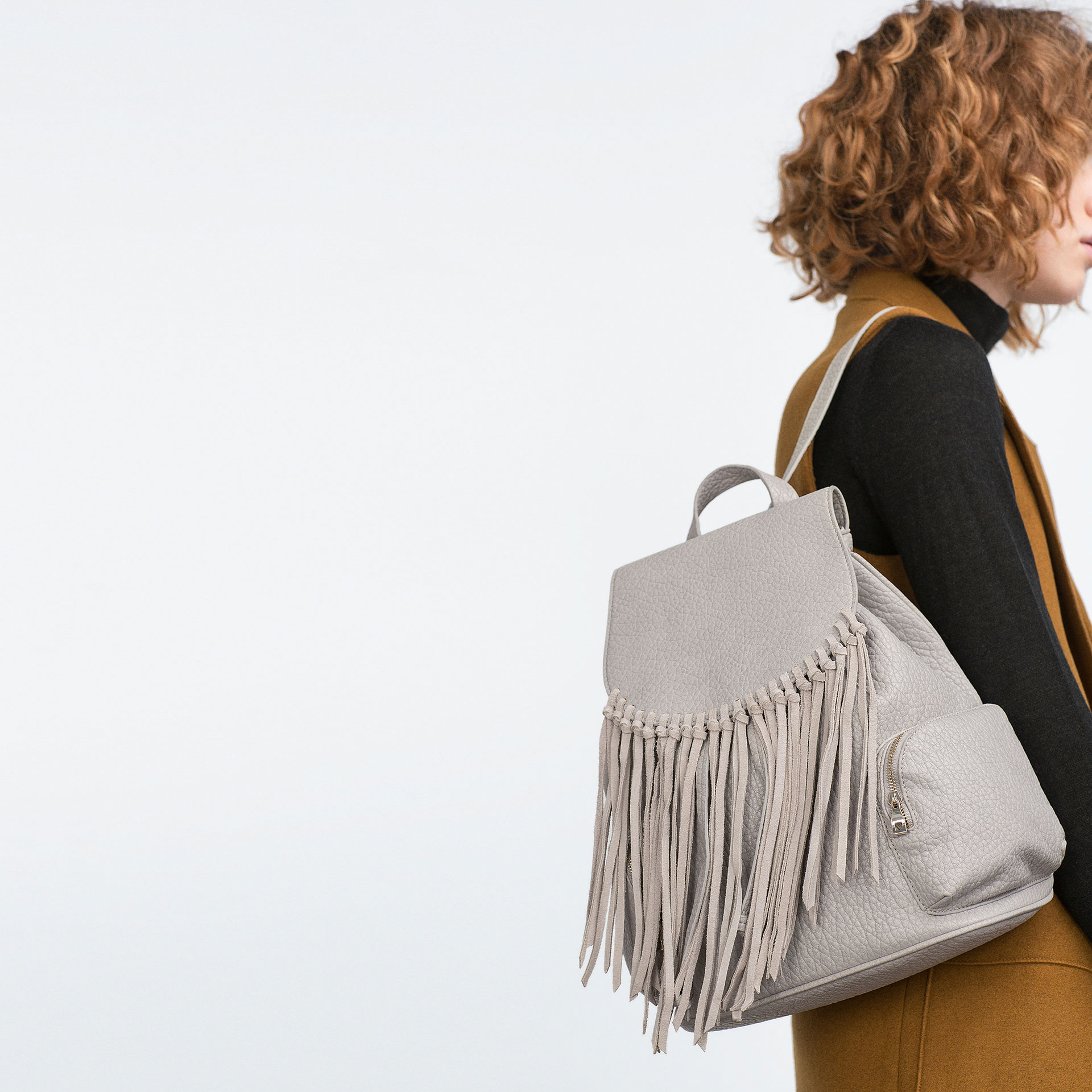 3) Zara’s Grey Fringed Foldover Flap Backpack, $60
