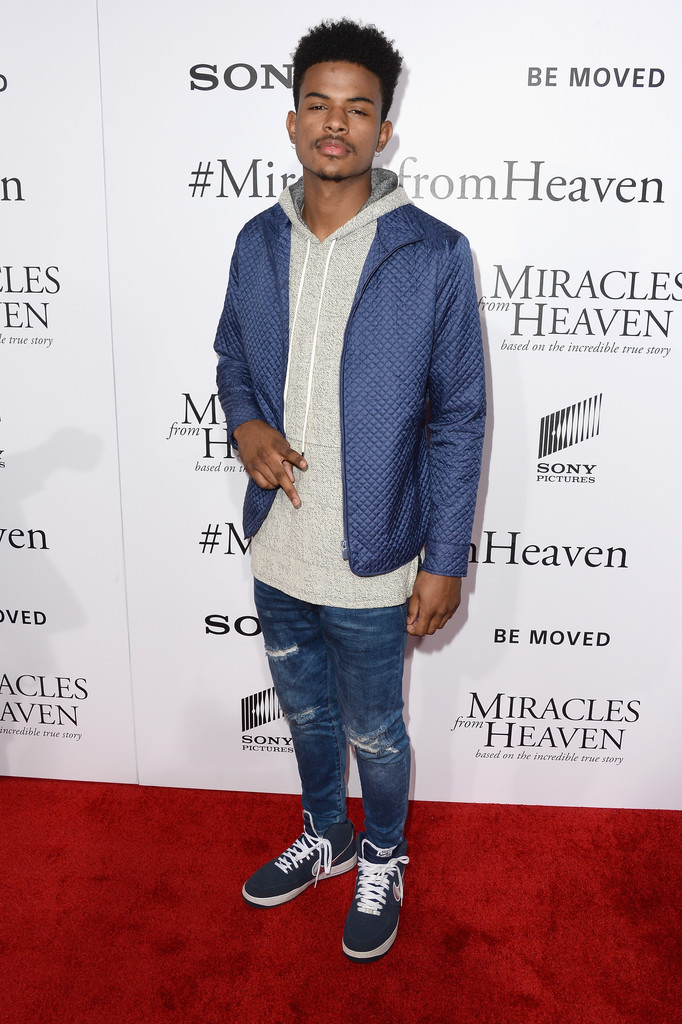 Actor Trevor Jackson went the comfortable route in a pair of fitted jeans, grey sweatshirt and bomber jacket.