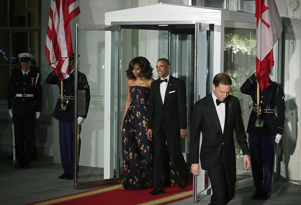 After a press conference was held at the White House with Canadian Prime Minister Justin Trudeau, President and First Lady Obama hosted a State Dinner in his and his wife’s honor. FLOTUS gave a nod to her love for Canadian designers, slipping on a custom Jason Wu strapless floral gown, inspired by prints in the Fall 2016 collection: