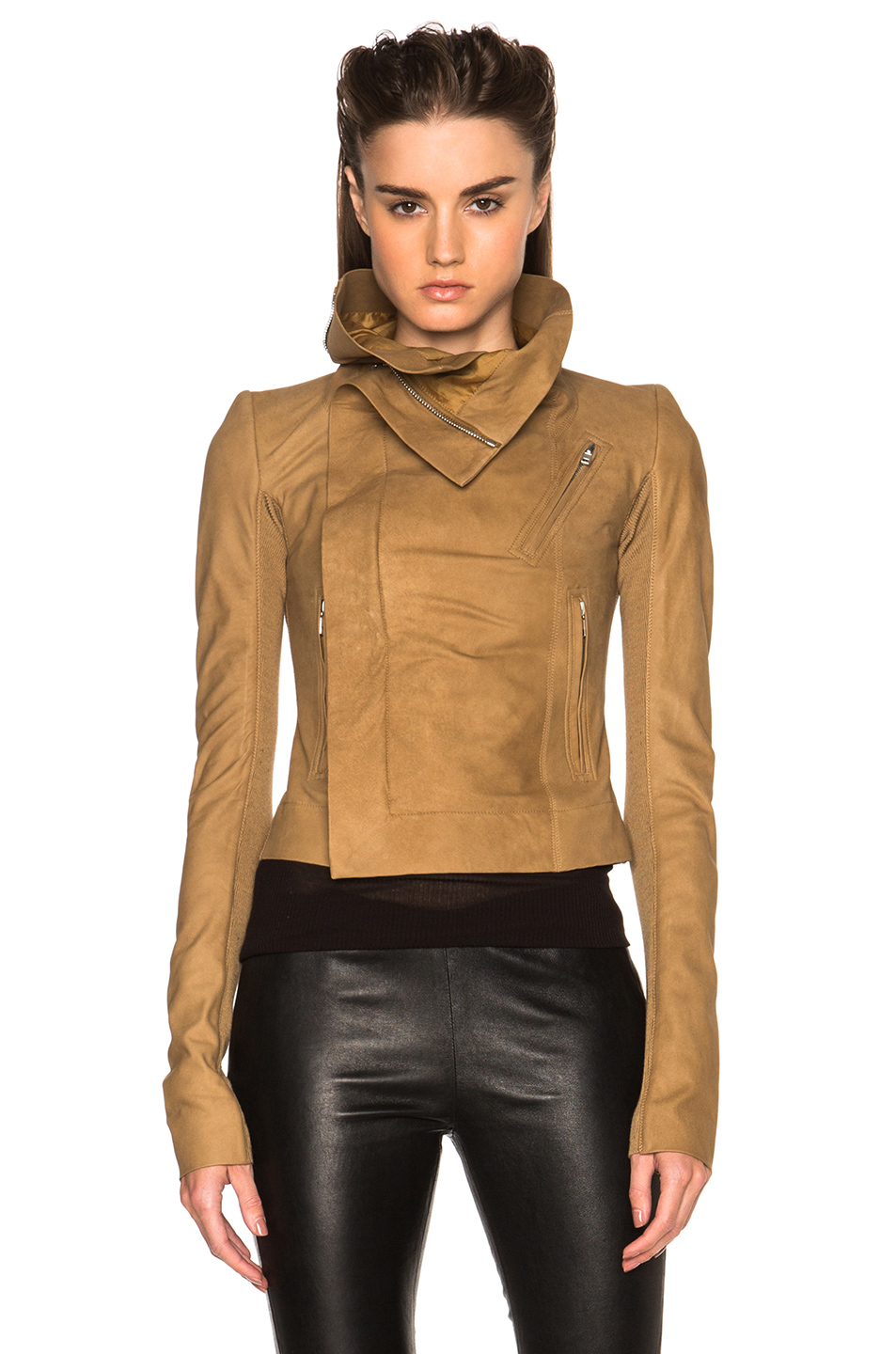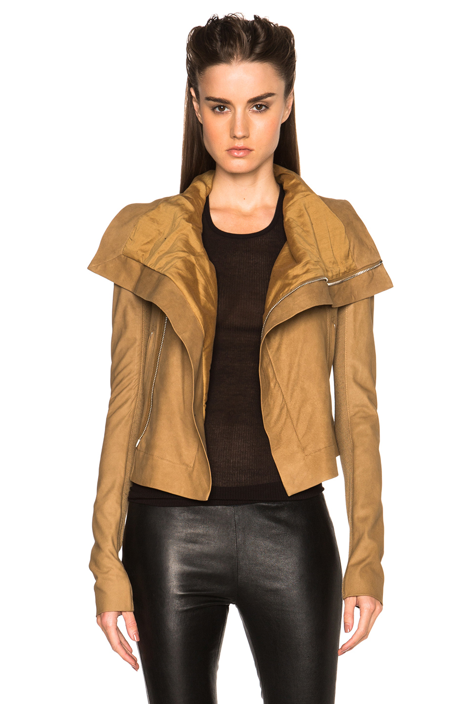 The jacket is made of 100% lambskin leather with a cotton/silk blend for the lining. It also has a hidden zip front closure and side zip pockets.