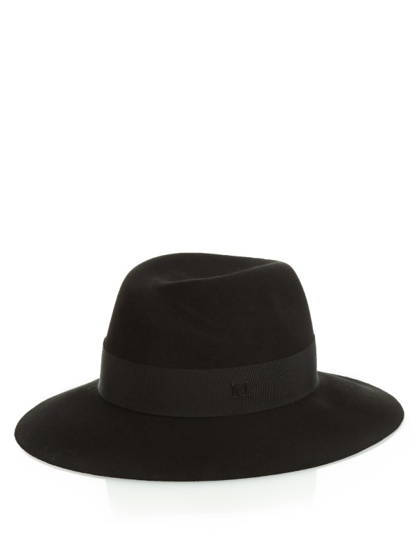 Her black hat is handmade and crafted from rabbit-fur felt. It features an asymmetric molded crown and grosgrain band with the brand’s logo plaque.