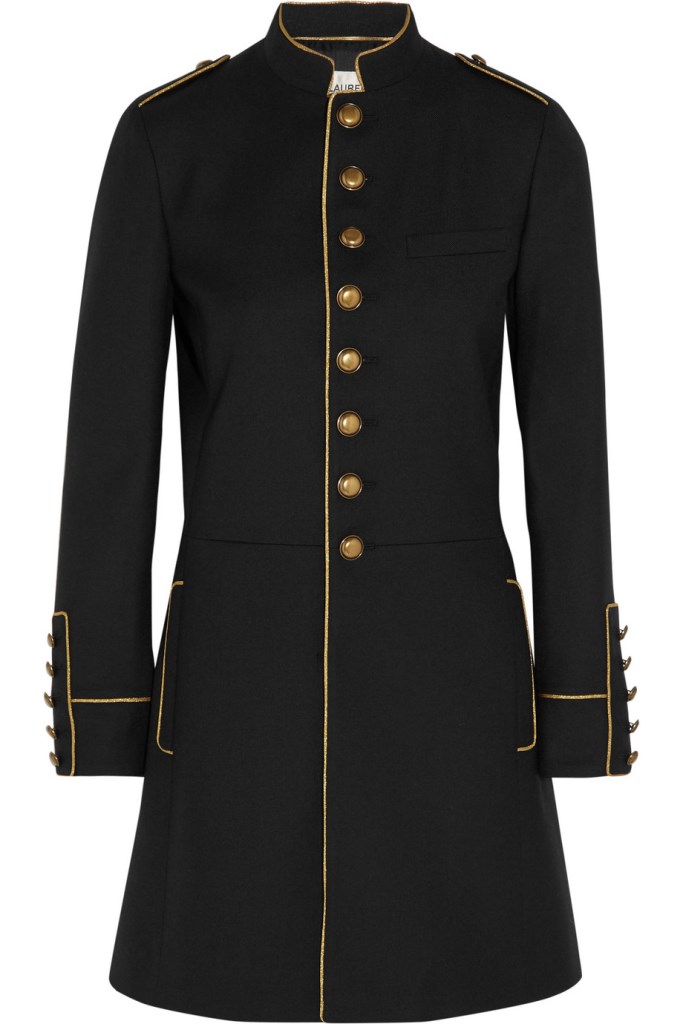 Her military-inspired jacket is crafted from soft wool-twill. It boasts gold trim and burnished buttons.