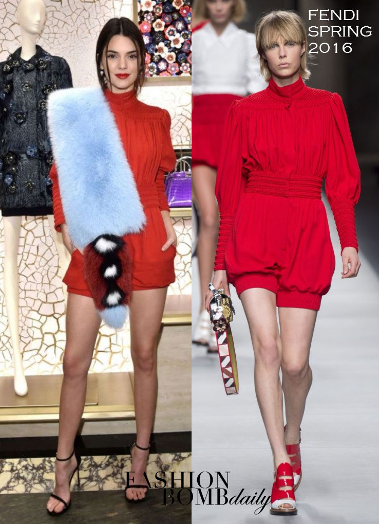 Kendall Jenner was the lady in red in Rome at the Palazzo Fendi and Zuma Inauguration. Naturally, she wore pieces from the brand—accenting a Spring 2016 Red Silk Satin Playsuit with a colorful scarf:
