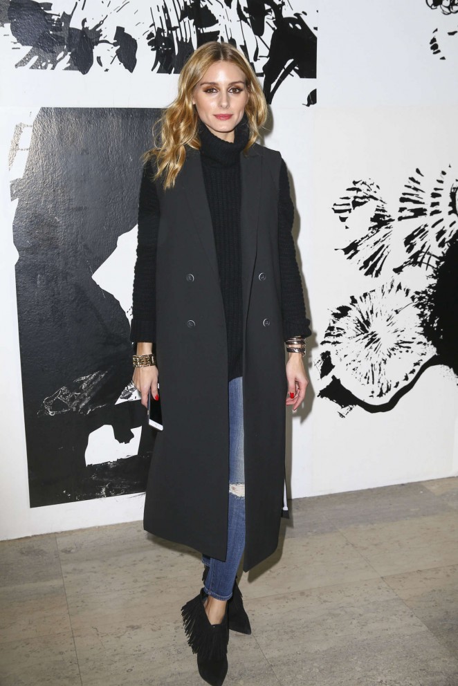 Olivia Palermo took in the Paul & Joe show, sporting a $150 Topshop Black Maxi Duster Coat, $1,105 Iris Von Arnim Black Cashmere Sweater, and $497 Saint Laurent Black Suede Fringe High Heel Booties: