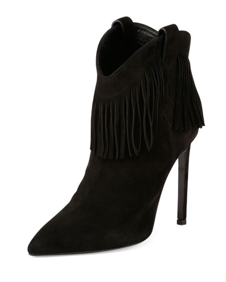 Her Western-inspired booties feature 4.3″ heels, a pointed-toe silhouette, fringe detailing, dipped tops, and side pull-tabs.
