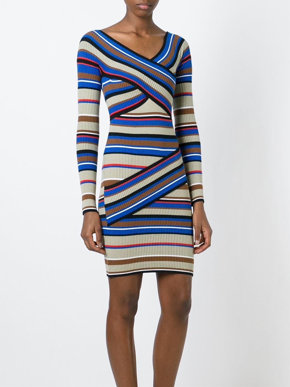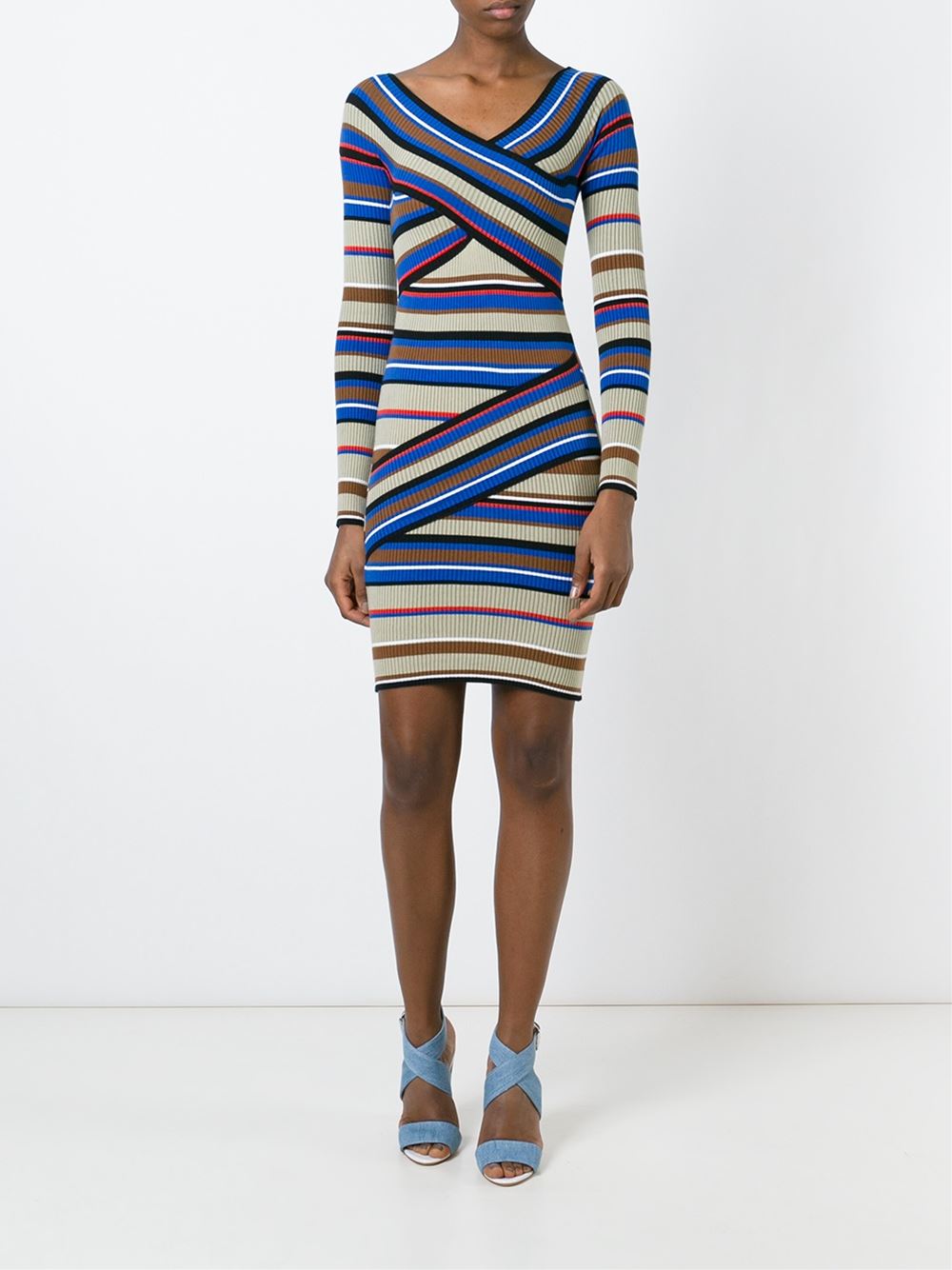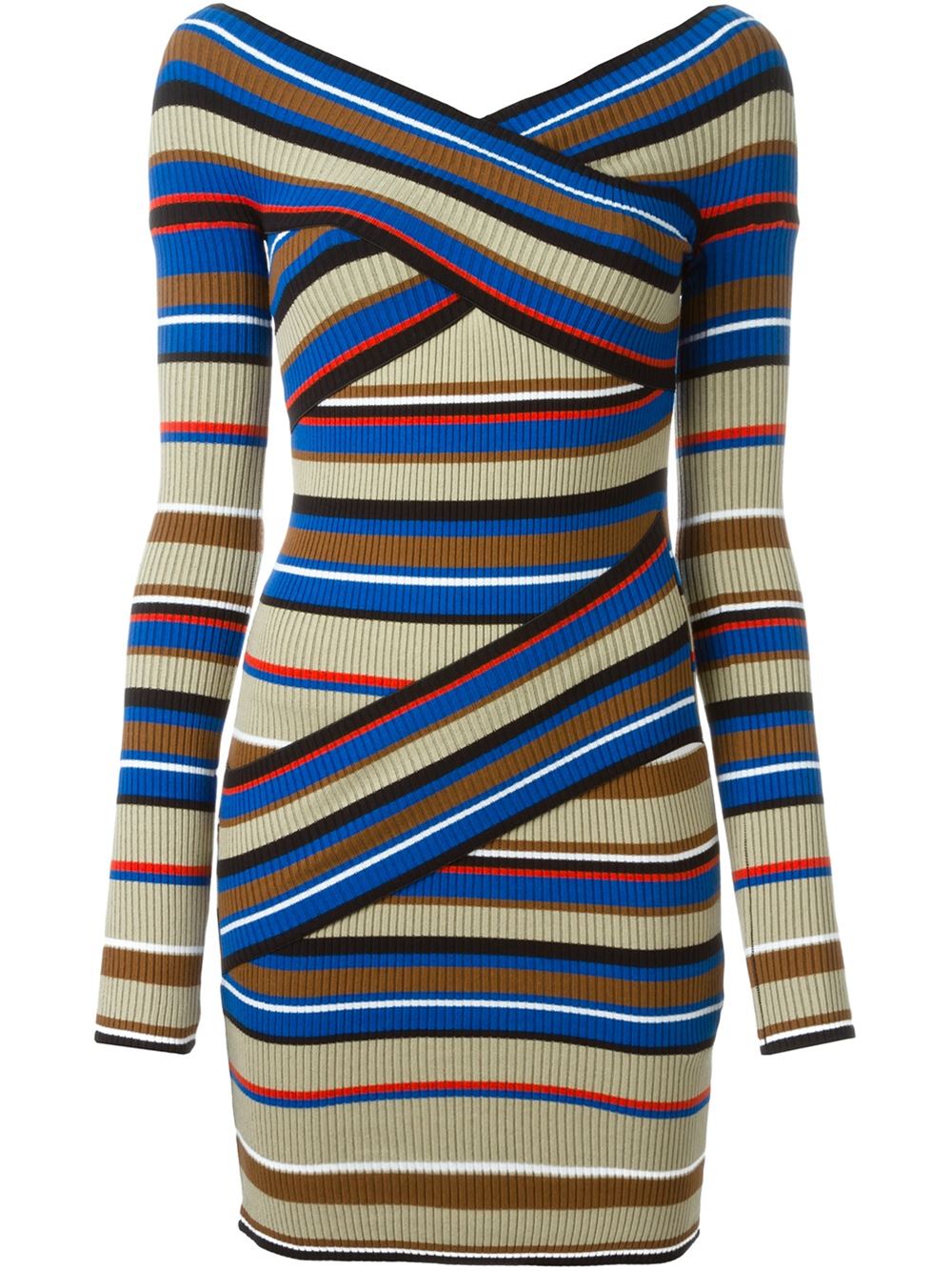 Her multicolored cotton blend knitted bandage dress from MSGM features an off the shoulder design, a striped pattern, long sleeves, a fitted silhouette, and a straight hem.