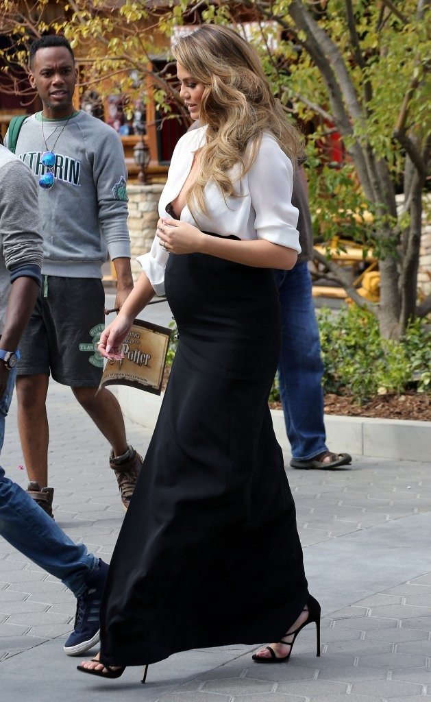 Chrissy Teigen accented a low-cut white blouse and strappy black sandals with a $1,355 Mugler Black Split Stretch Cady Maxi Skirt while making an appearance on Extra: