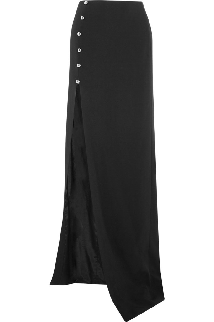Her black maxi skirt features a thigh-high slit, gunmetal buttons, and a high-waist.