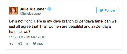 Where the antisemitic claims came into play, we’re not quite sure. Whether joking or not, throwing out a declaration of someone’s intolerance for another demographic is never funny, cute, and clearly shows how insensitive and low Klausner was willing to take the conversation. Plus, how could she have tweeted that all women are beautiful when she had just attacked Zendaya for her body size, which to me, looks fine and appropriate for a young lady as tall as she is.