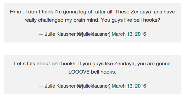 Klausner continued her twitter rant, going on to remark on Zendaya’s career and her irrelevance to society, all the while continuing to poke fun of Zendaya’s body size in quite childish fashion: