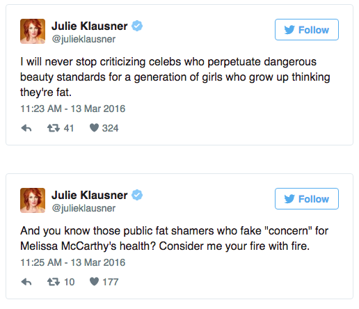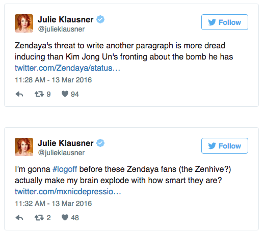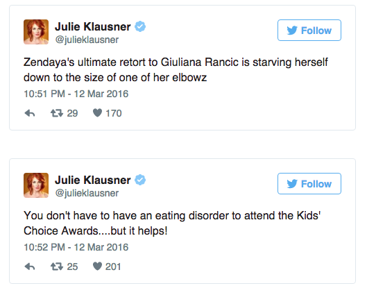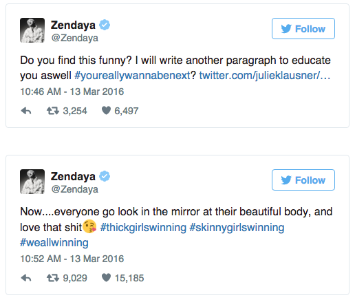 However, the story did not end there although Zendaya’s response was, in all fairness, appropriate and respectful. Unfortunately, Klausner felt the need to continue the twitter feud, then responding to the slew of Zendaya’s twitter fans who began accusing her of body shaming. Klausner’s response? She “will never stop criticizing celebs who perpetuate dangerous beauty standards.“