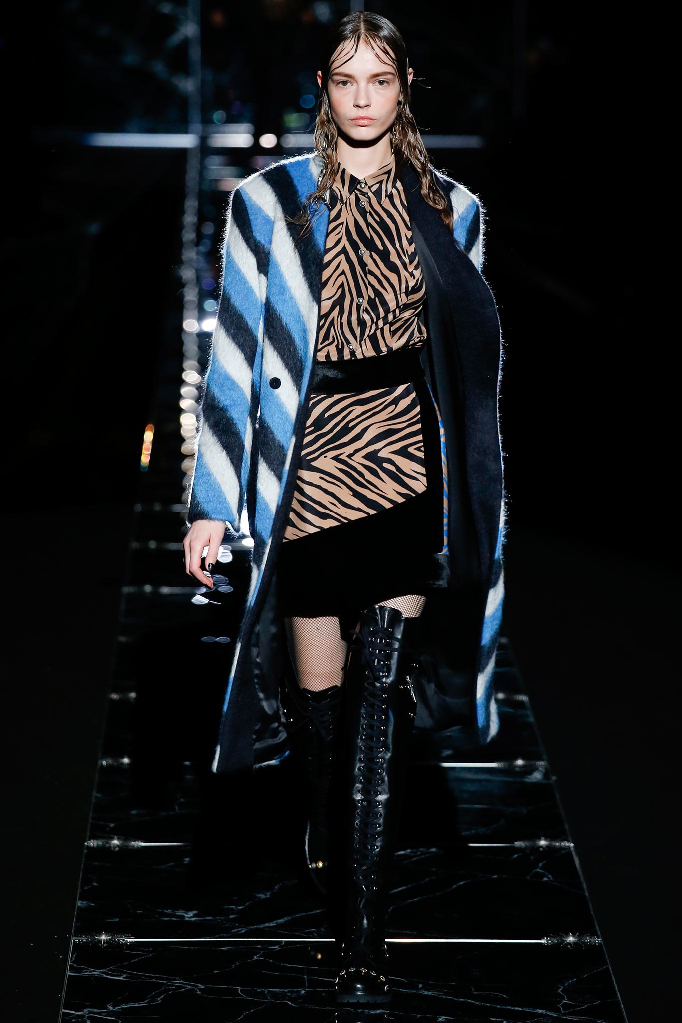 The coat is from the Fall 2015 Ready-to-Wear line, and features bright black, white and cerulean diagonal stripping along the fur.