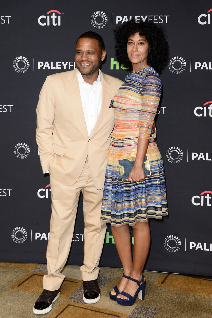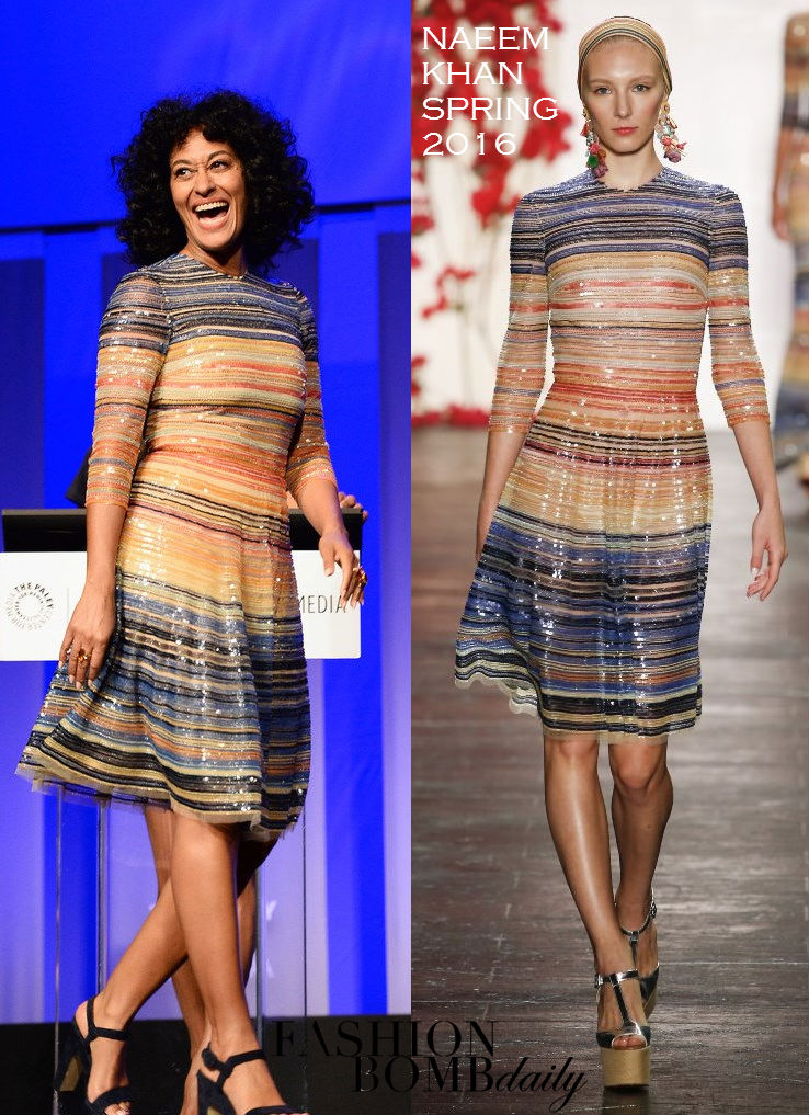 Tracee Ellis Ross shimmered and sparkled at The Paley Center For Media’s 33rd Annual PALEYFEST Black-ish Panel. For the occasion, she was clad in a Naeem Khan Spring 2016 Multicolor Sequin Stripe Dress and $845 Paul Andrew Navy Stanton Sandals:
