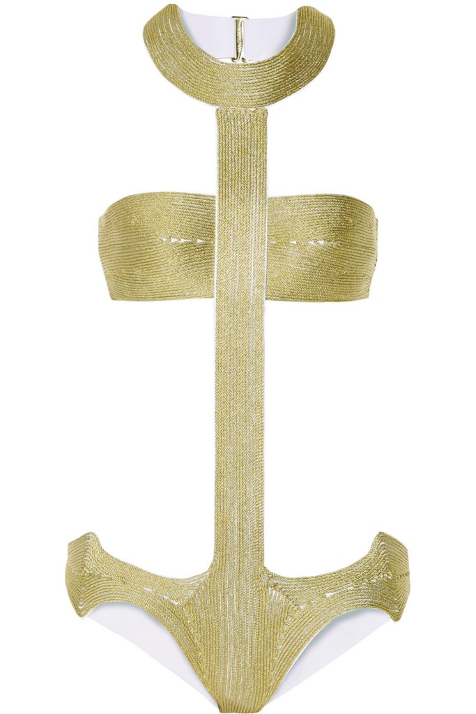 Her gold and white neoprene one-piece features cutout detailing in the shape of an anchor, metallic cord embroidery, and a solid white back.