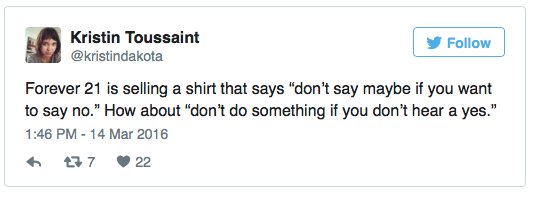 While the argument can be understood that perhaps the shirt aims to suggest that if you don’t want sex in the first place, one can merely say no, I think it was insensitive and completely offensive to even make a suggestion that a ‘maybe’ justifies, in any way, shape or form, action that can not be forfeited once someone says no. I also feel it’s a true slap in the face for all victims of rape, who have had something of theirs taken from them unwillingly, and yet, it was okay because they initially agreed to some level or degree.