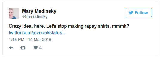How do YOU feel about a T-shirt that references, subtly or not so subtly, the idea of rape culture that so many women and have men have vocalized in the field of consent and rights? Is the shirt victim-shaming, or is it really not that serious? Sound off!