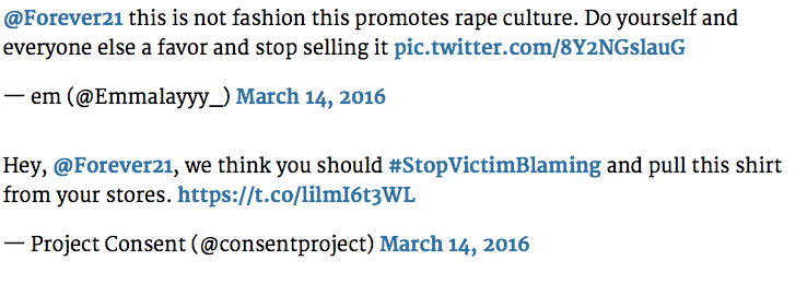 Forever 21 has since removed the shirt from their inventory, publicly stating that, “Forever 21 strives to exemplify the highest ethical standards and takes feedback and product concerns very seriously,” Forever 21 said in a prepared statement to The Huffington Post. “With regards to the T-shirt in question, upon receiving feedback from our customers, we took immediate action to have it removed from our website. We sincerely apologize to anyone who was offended by the product.”