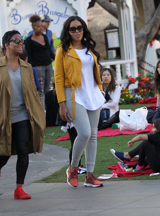Angela Simmons wore her favorite Zara leather while indulging in some retail therapy at The Grove, giving a pop of color to a neutral t-shirt and leggings.