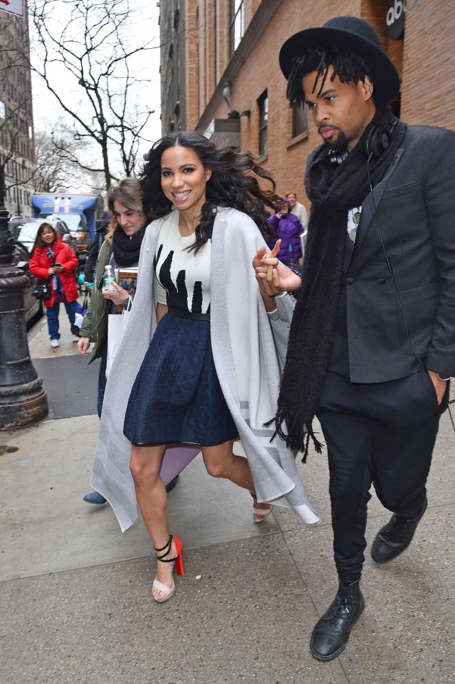 Jurnee Smollett-Bell made an appearance on The Chew in a grey graphic poncho, black and white embroidered sweater, navy quilted skirt, and Christian Louboutin sandals. Pretty!