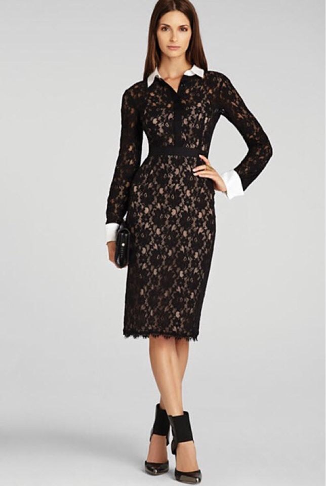The dress features long sleeves, collared neck, and an all-over lace detailing under a borrowed-from-the-boys collar.