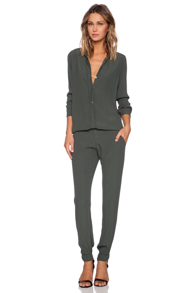 Her one-piece features front button closures, button cuff sleeves, an elasticized waist, and banded leg openings.